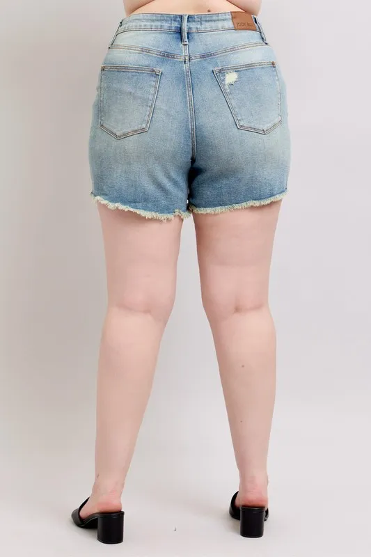 Judy Blue Full Size High Rise Washed Fly Stitch Detail and Destroy Denim Shorts Plus Size