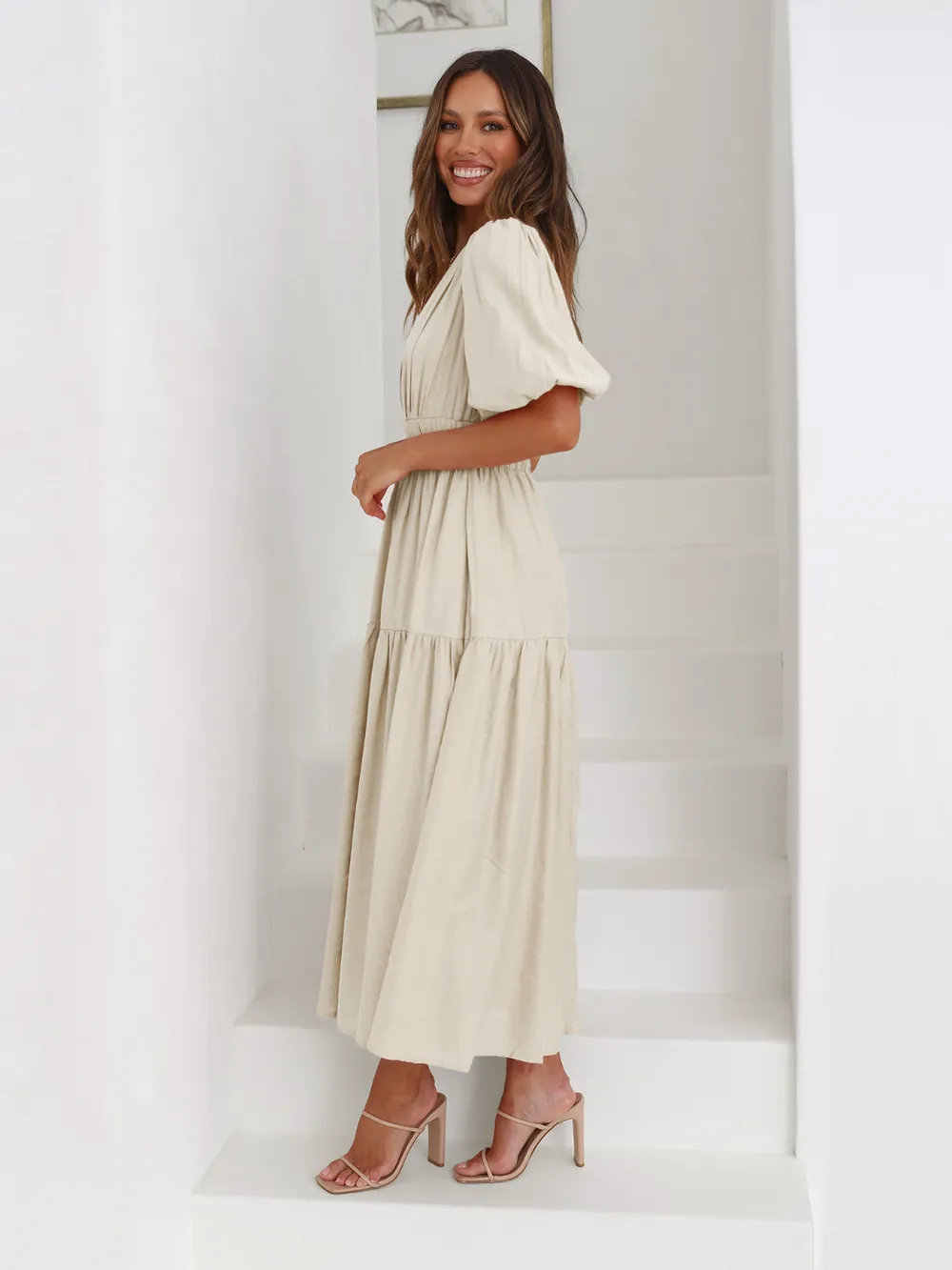 This stunning tiered surplice midi dress combines feminine elegance with comfortable wearability. Crafted from lightweight, breathable fabric in a sophisticated beige tone, it features a flattering wrap-style bodice with surplice neckline that enhances the décolletage. The half sleeves with subtle puff details add romantic charm, while the smocked elastic waistband ensures a perfect fit. The multi-tiered skirt creates beautiful movement and flow, making it ideal for dancing or casual strolling. The midi length offers versatility for both day and evening wear, easily dressed up with heels or down with sandals. Perfect for spring and summer occasions, from brunch dates to garden parties.