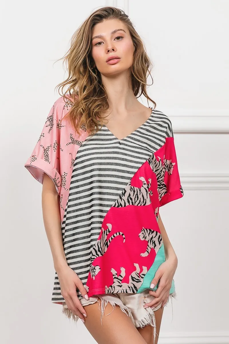 Detailed description of the BiBi Tiger W Stripe Contrast Color Block V Neck Top, highlighting quality, design, and unique features that make it appealing to end consumers.