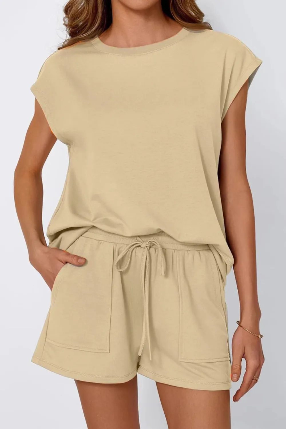Round Neck Cap Sleeve Top and Shorts Set