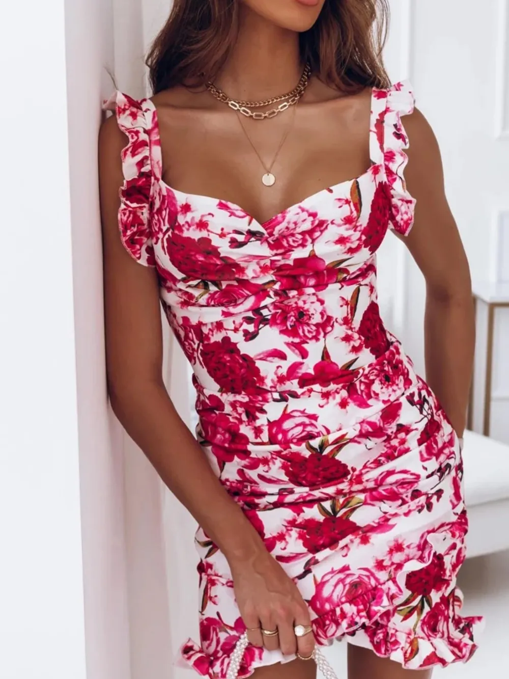Floral Ruffle Strap Sweetheart Neck Mini Dress