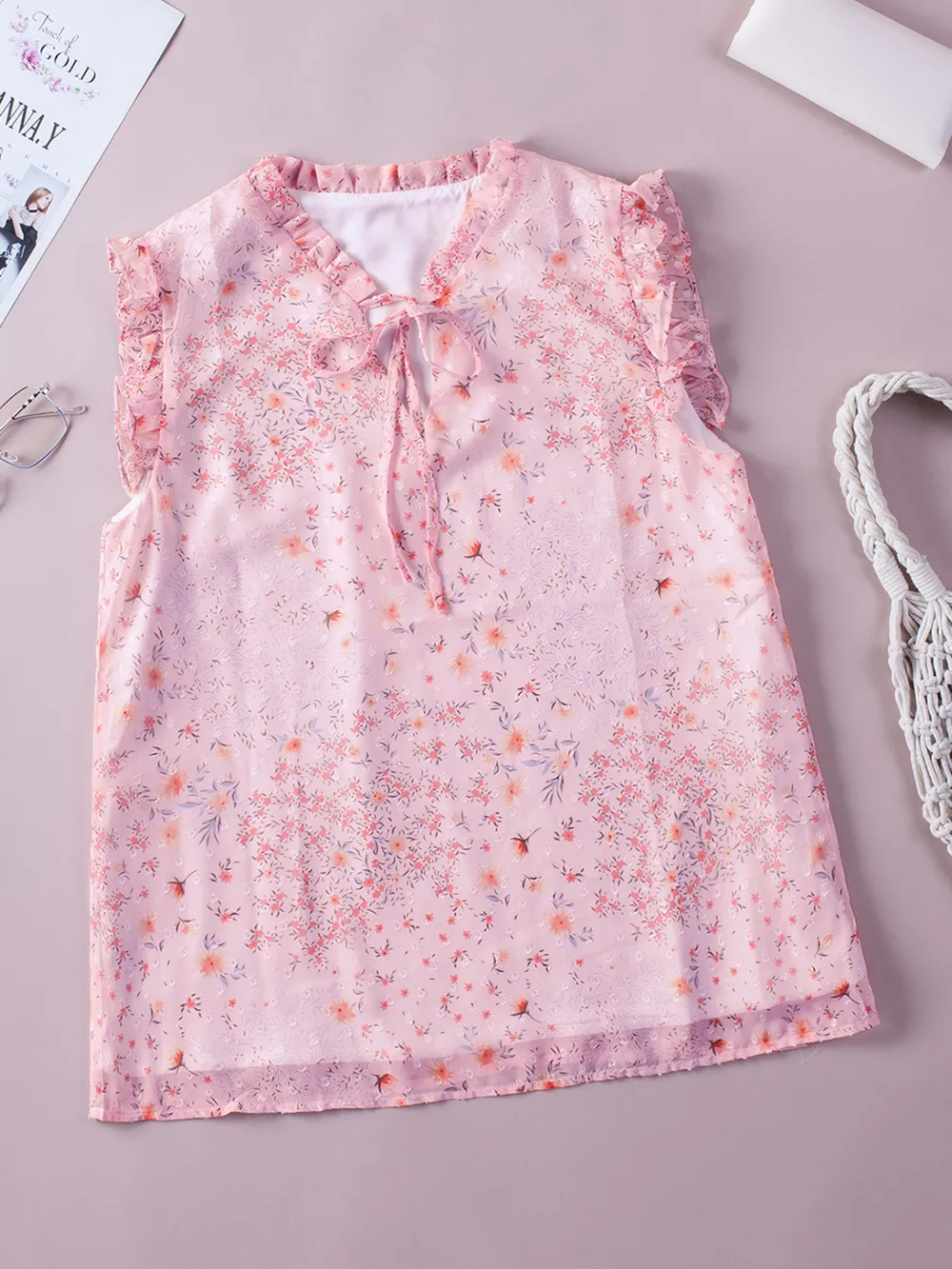 Floral Ruffle Tie Neck Sleeveless Blouse