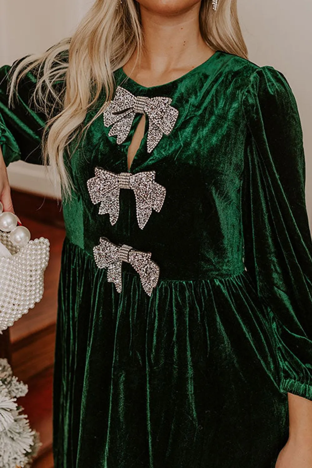 Velvet Bow Front Balloon Sleeve Dress