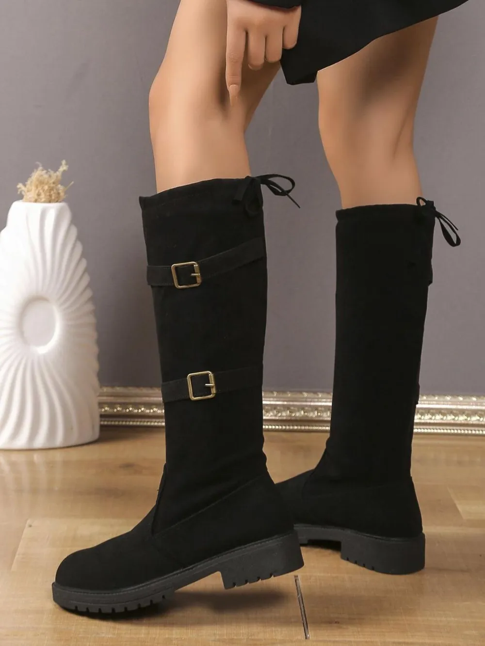 Suede Knee-High Combat Boots with Double Buckle Straps