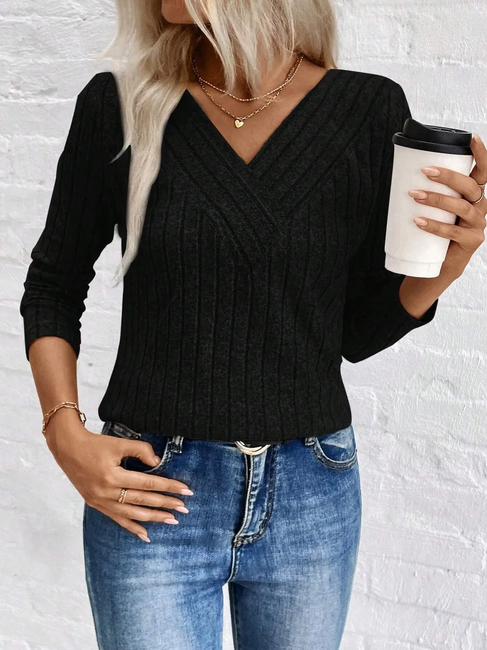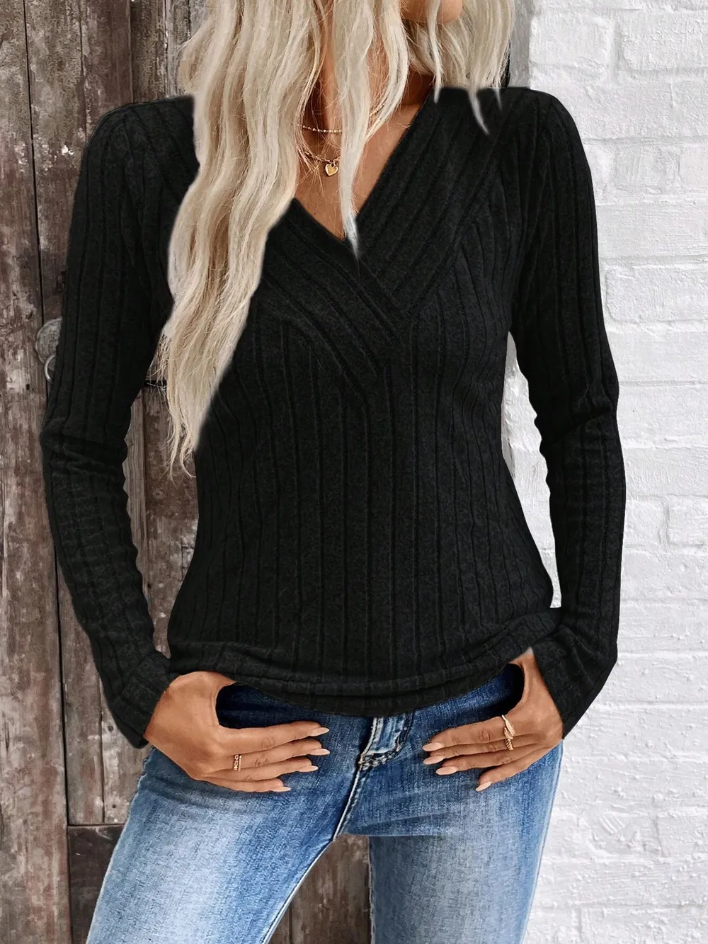 Ribbed V-Neck Long Sleeve Knit T-Shirt