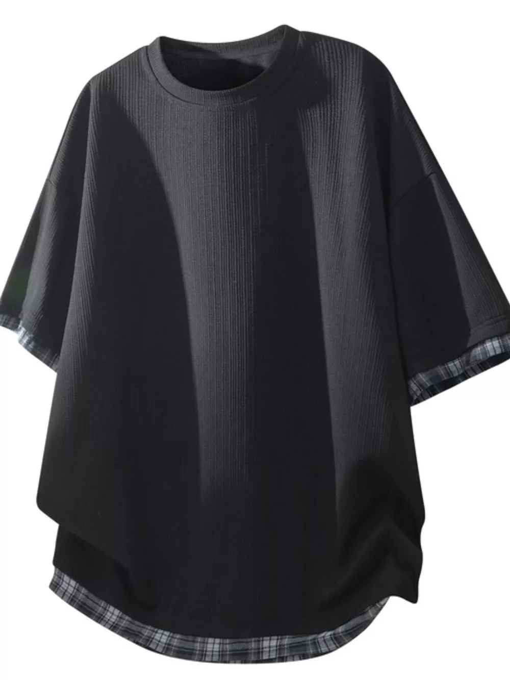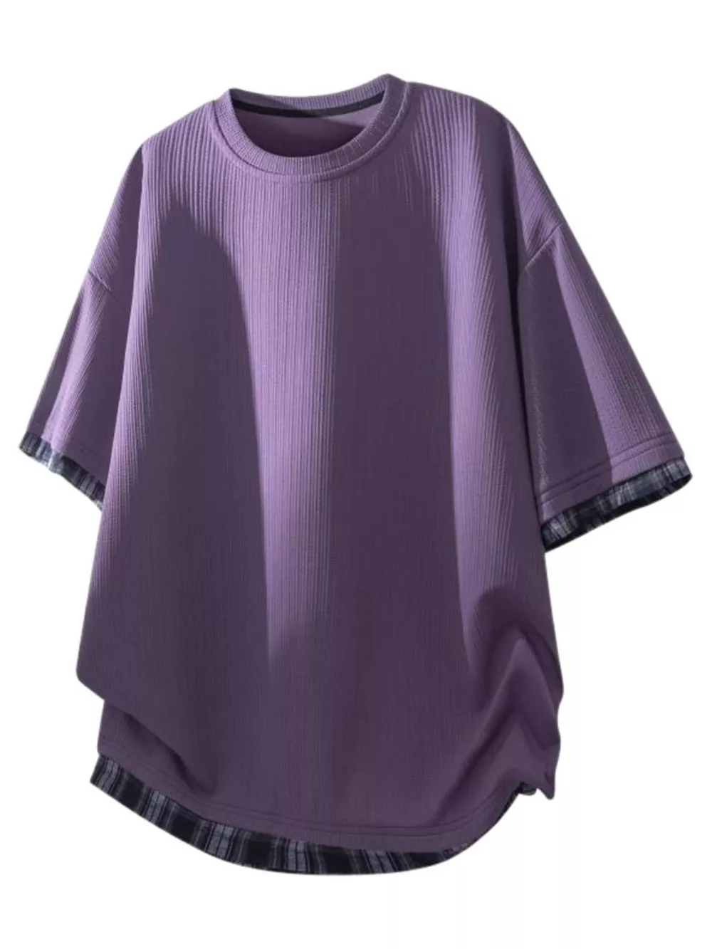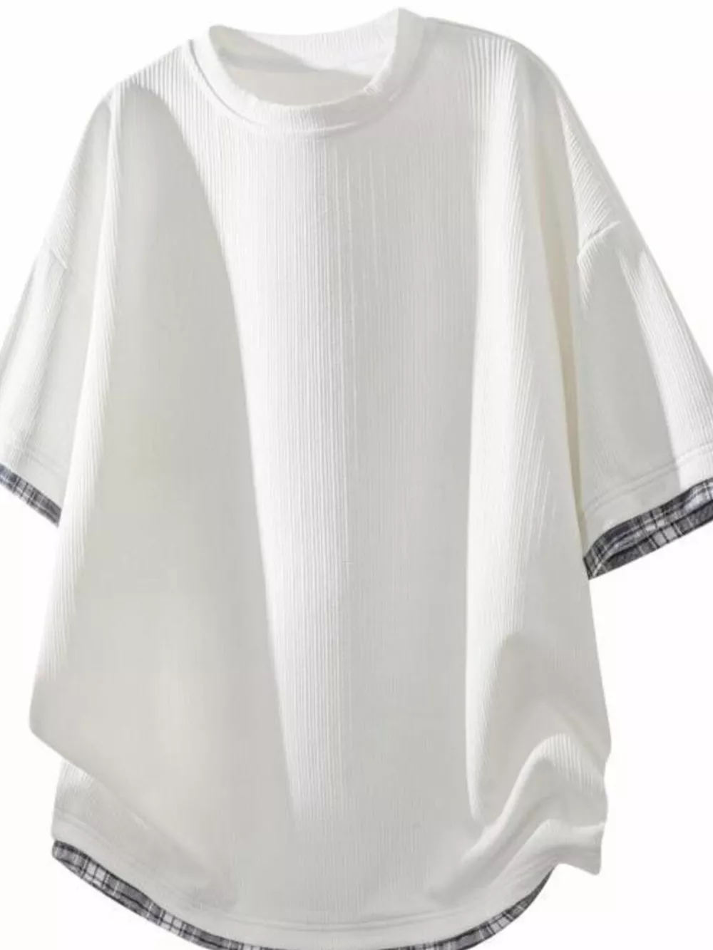 Men's Plus Size Short Sleeve Round Neck Plaid Trim T-Shirt