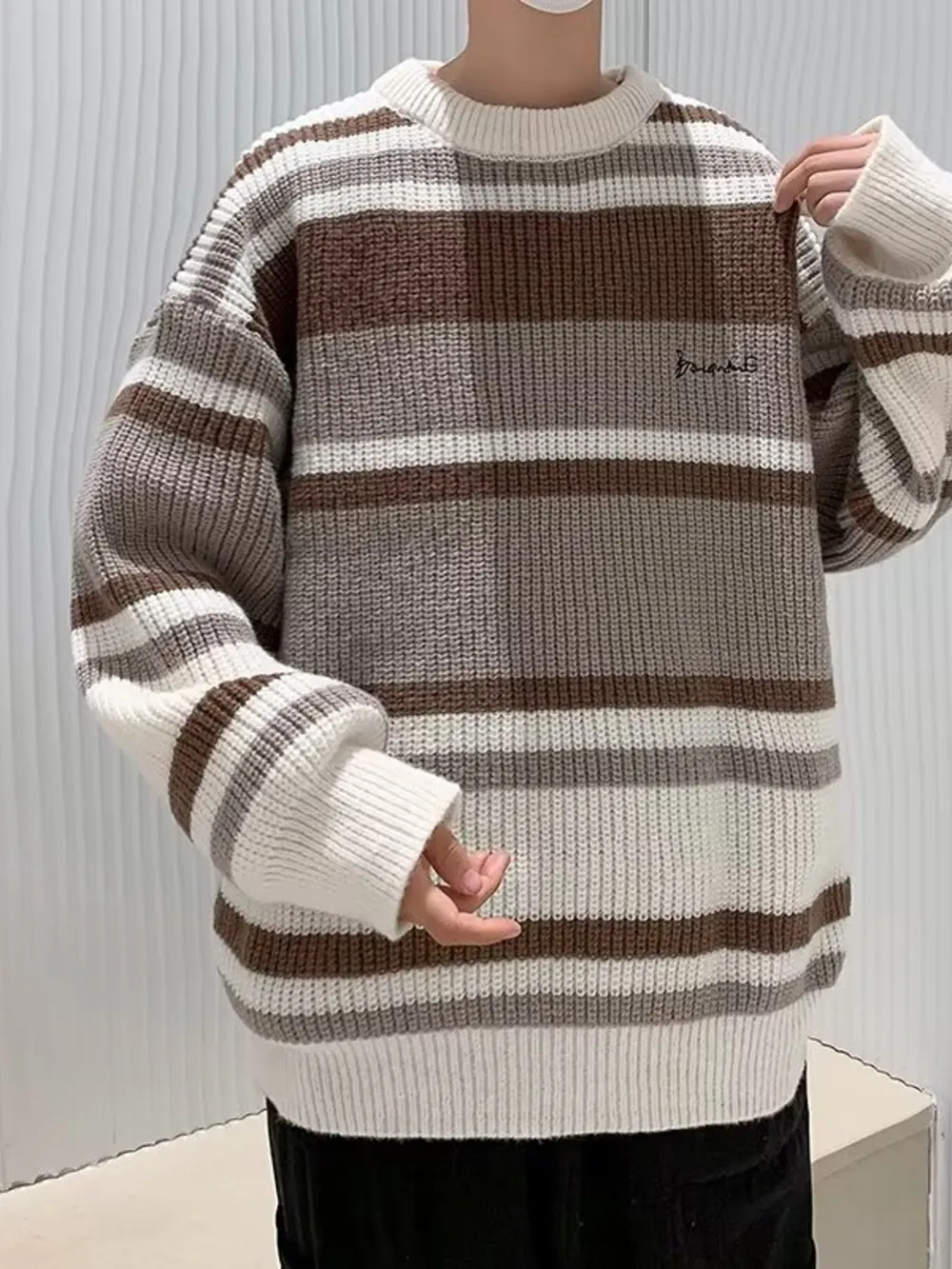Men's Striped Knit Pullover with Embroidered Detail