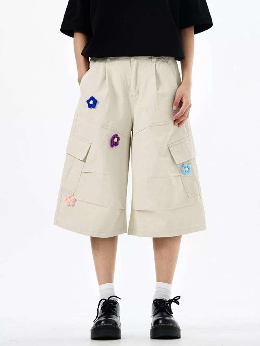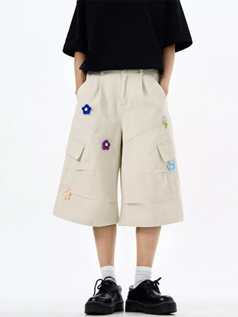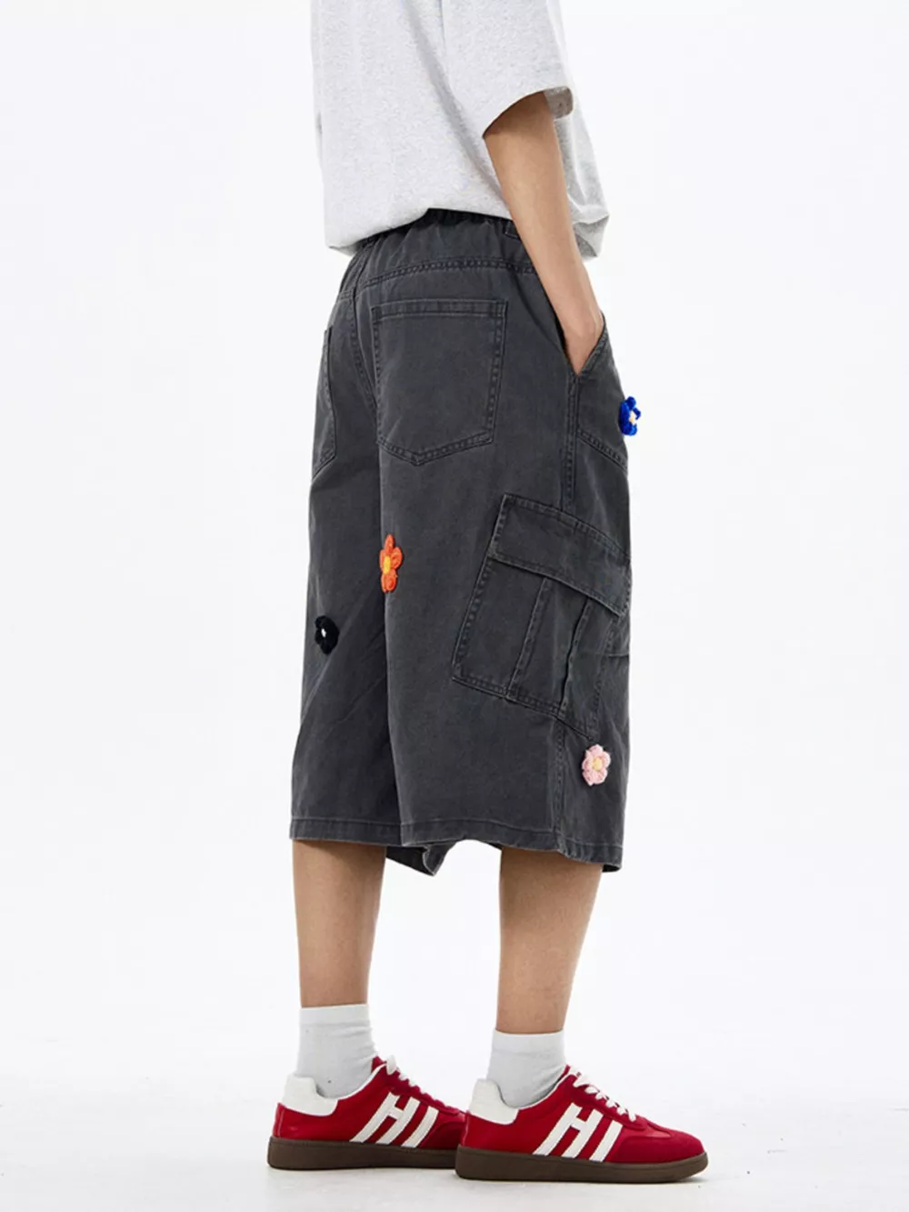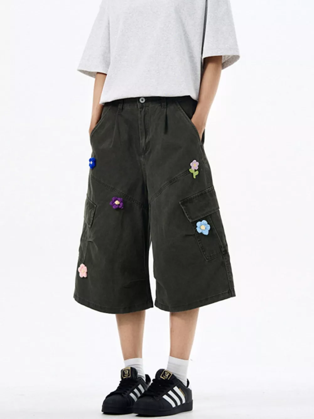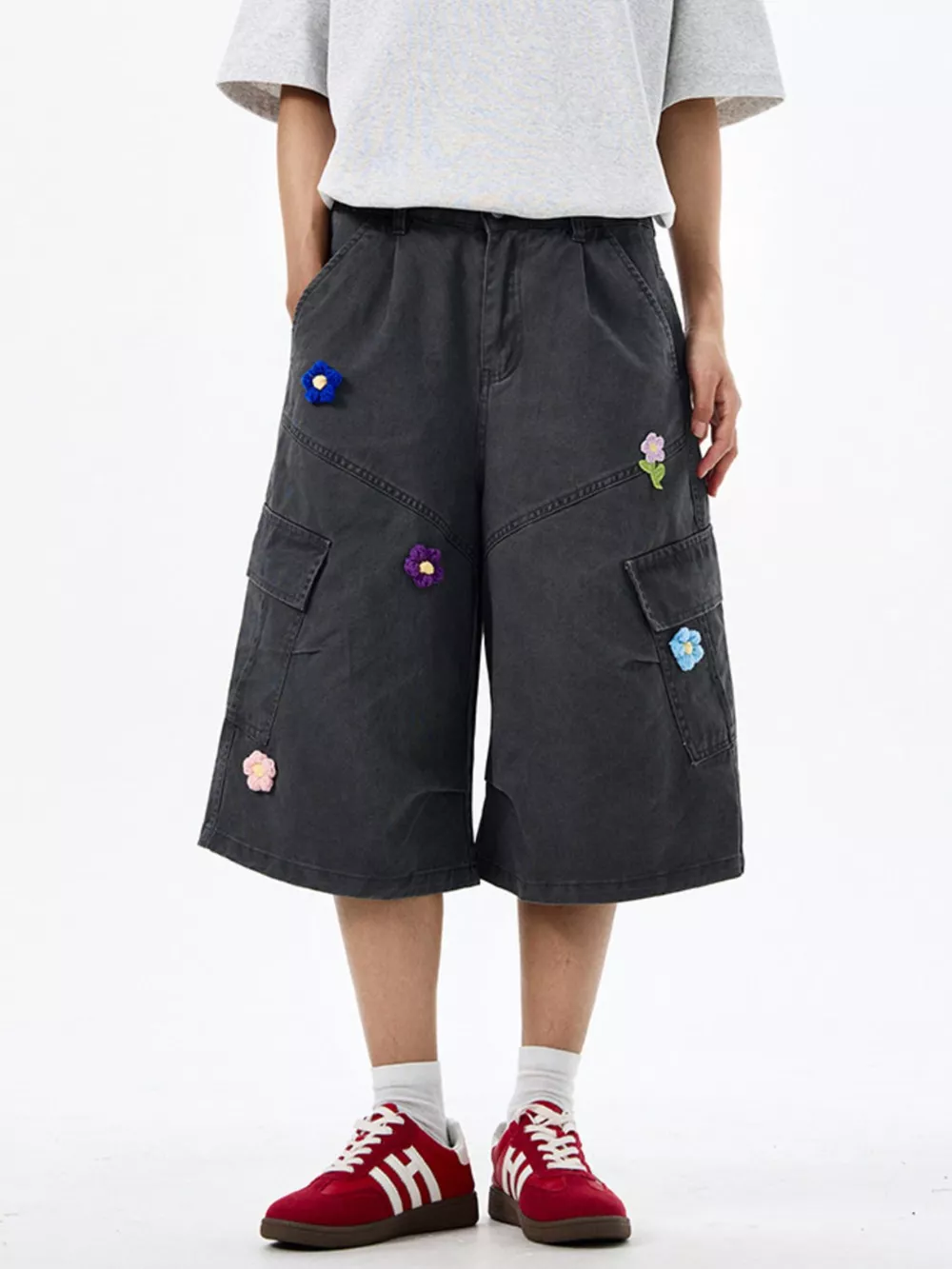Men's Floral Appliqued Wide-Leg Cargo Shorts