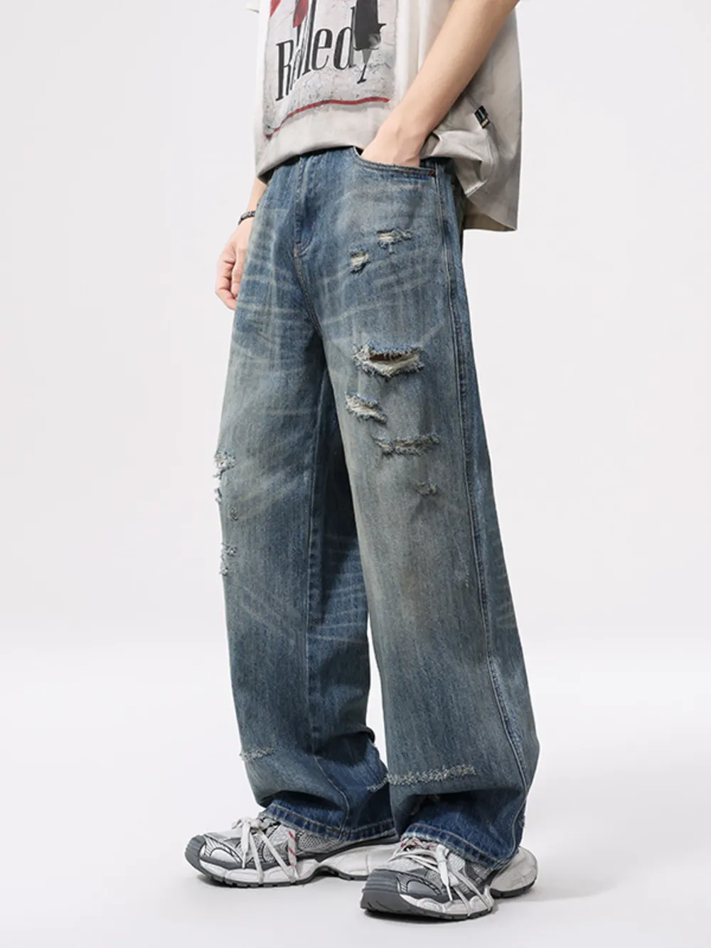 Men's Full Size Vintage Distressed Wide Leg Relaxed Fit Jeans Plus Size