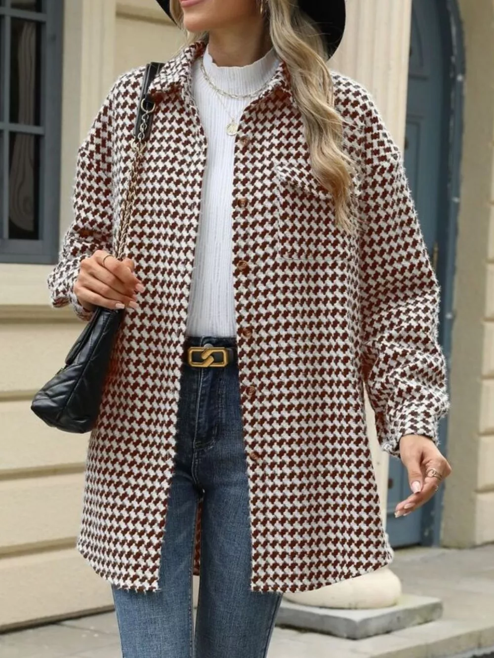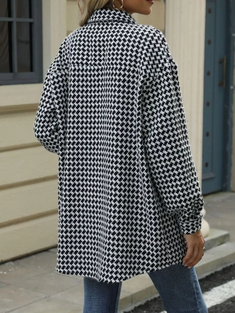 Houndstooth Button Up Long Sleeve Coat
