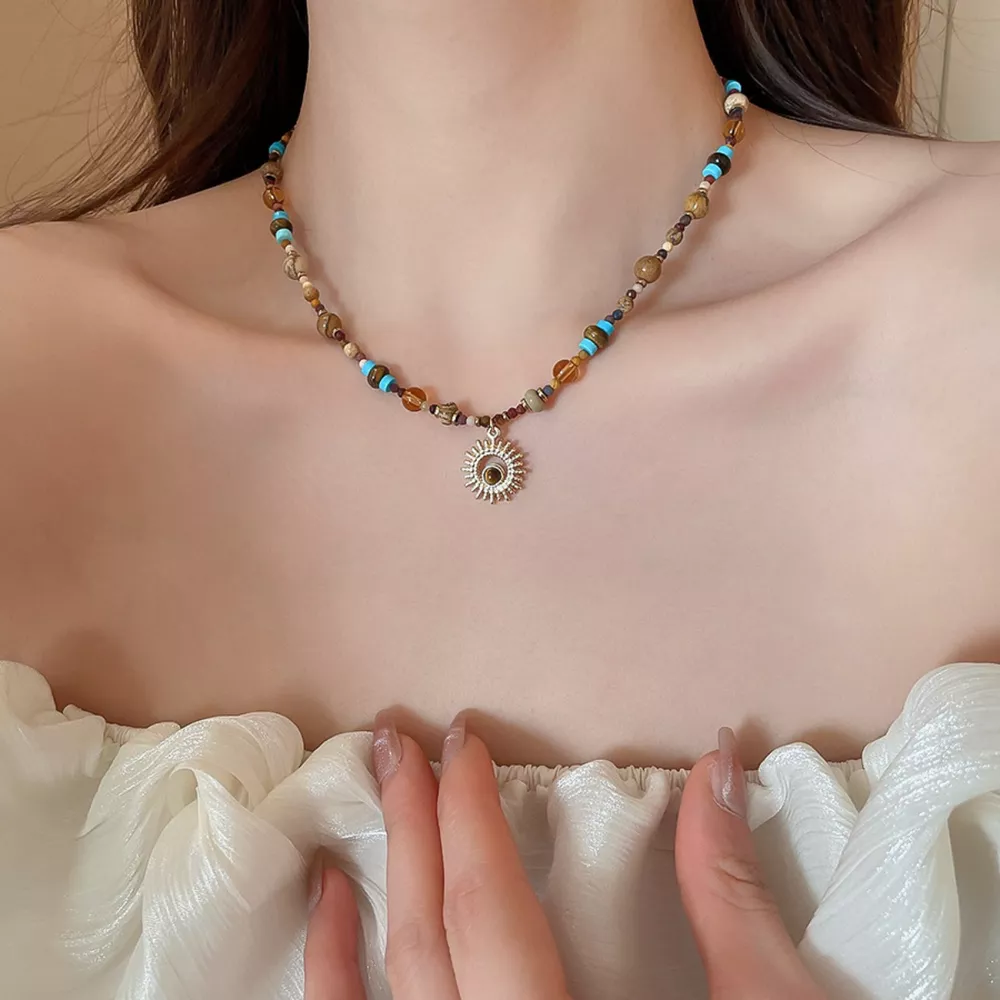 Multi-Color Beaded Sunflower Pendant Necklace