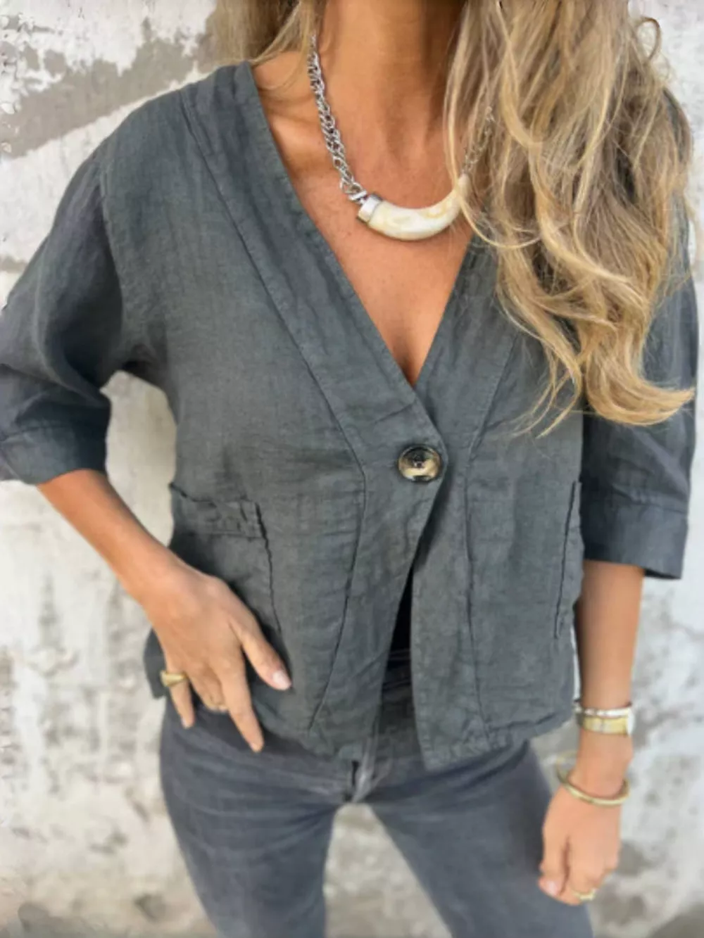 Full Size One Button V-Neck Shirt Plus Size