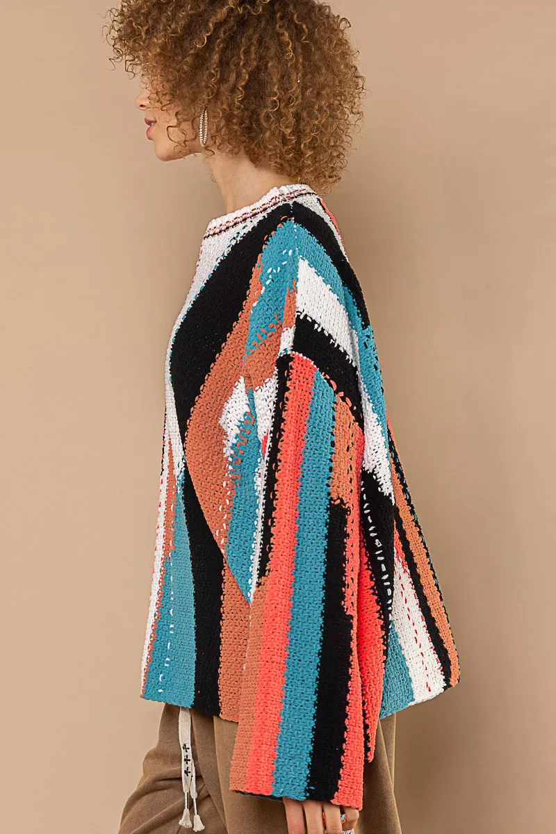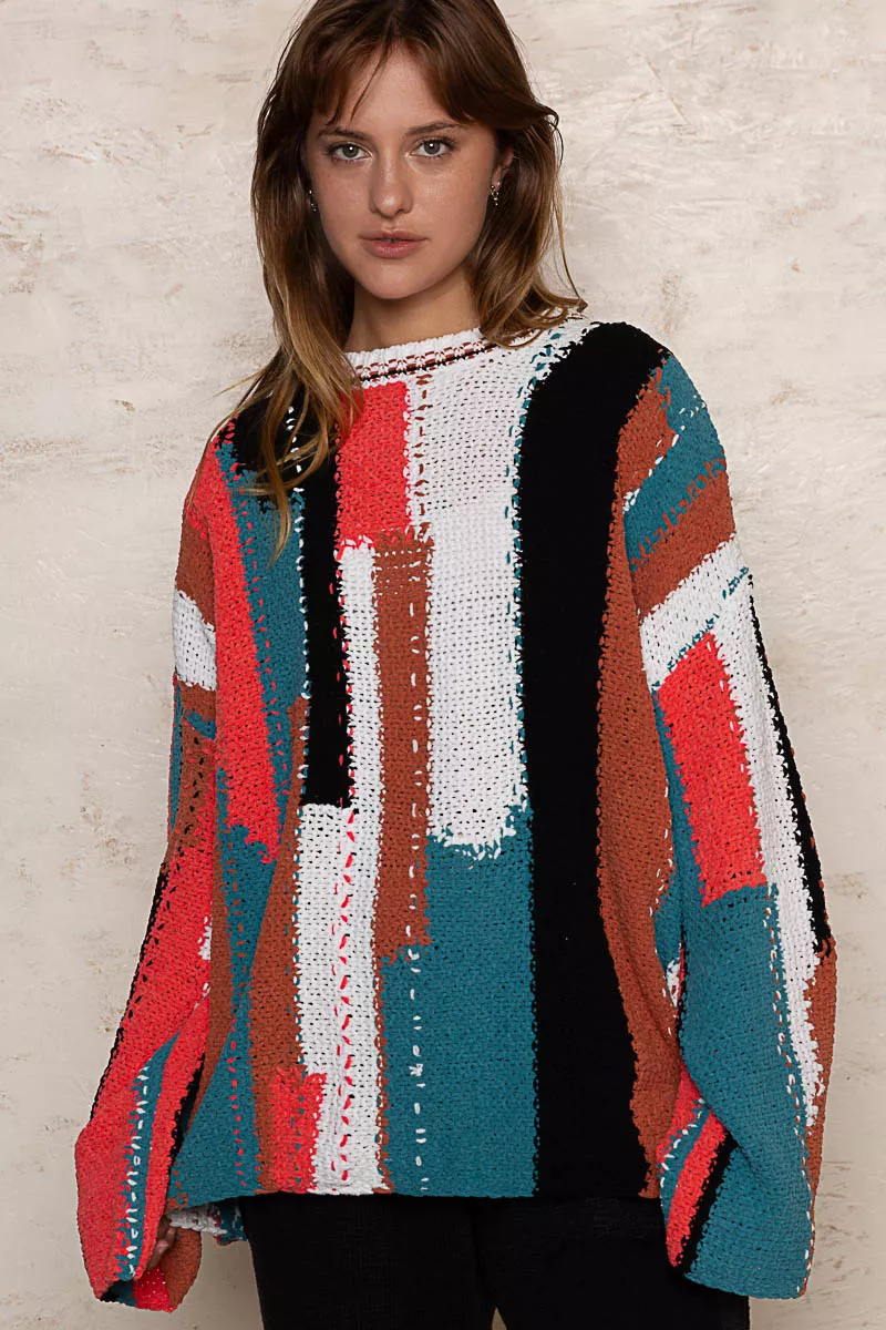 This striking oversized pullover features a bold geometric colorblock design with vibrant red, teal, black, and white sections. Crafted from soft knit fabric with varied textures and patterns, it offers a relaxed fit perfect for casual styling. The artistic patchwork design creates a contemporary statement piece, while the crew neckline and dropped shoulders provide comfortable wear. The thick knit construction makes it ideal for cooler weather, combining fashion-forward design with cozy functionality.