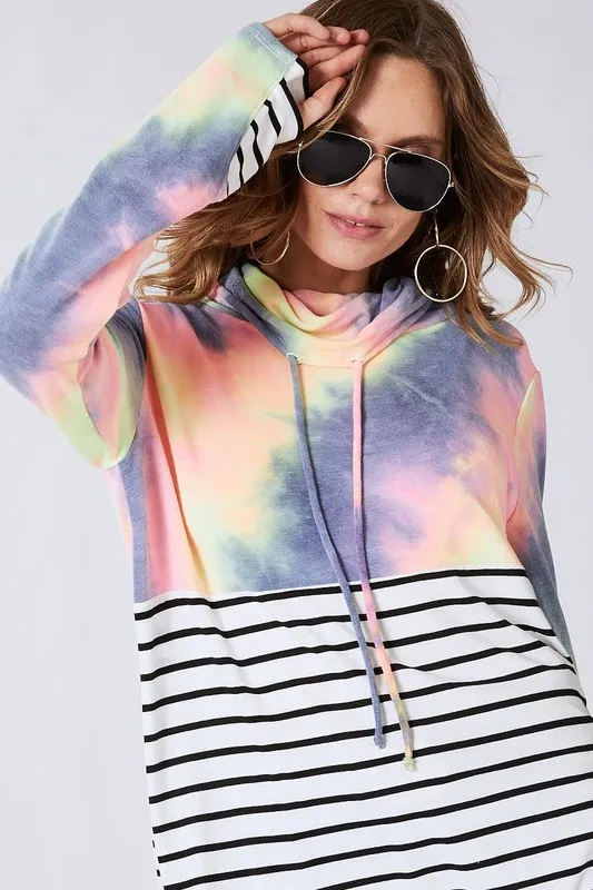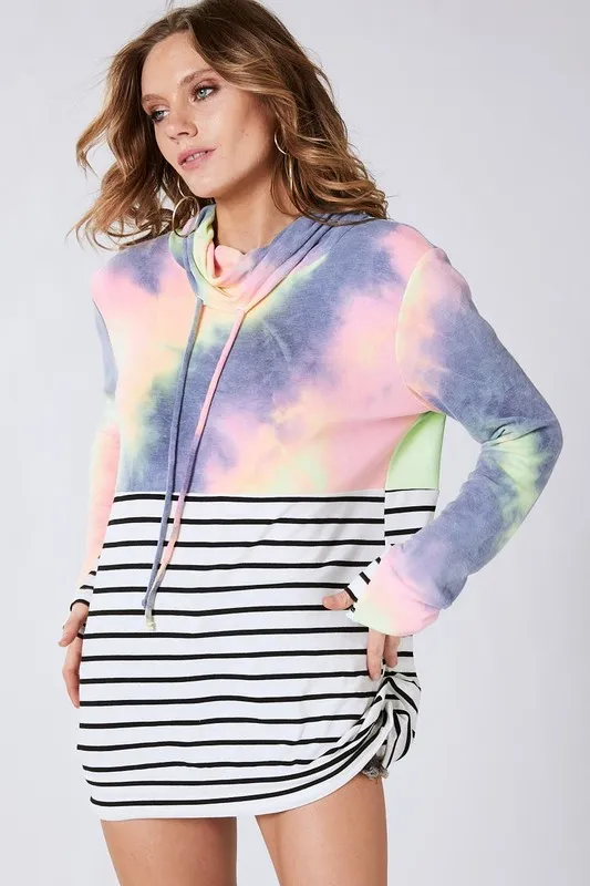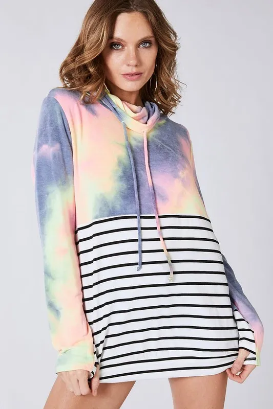 Add a pop of color to your wardrobe with this Tie Dye French Terry Cowl Neck Top. The unique tie-dye pattern creates a vibrant and eye-catching look that is perfect for any casual occasion. Made from soft French terry fabric, this top is both comfortable and stylish. The cowl neck detail adds a touch of elegance to the relaxed silhouette. Pair it with your favorite jeans or leggings for a fun and trendy outfit that will keep you cozy all day long.