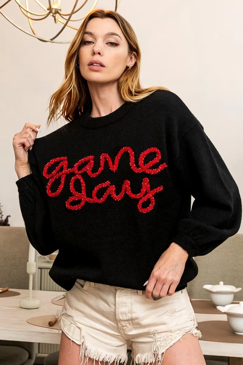 Show your team spirit in style with this Game Day Metallic Letter Sweater. The metallic letter design adds a touch of glamour and sparkle to this sweater, perfect for cheering on your favorite team. Made from high-quality materials, this sweater is both comfortable and eye-catching. Whether you're at the game or watching from home, this sweater is a stylish way to support your team. Pair it with jeans or leggings for a trendy and spirited look that will make you stand out on game day.