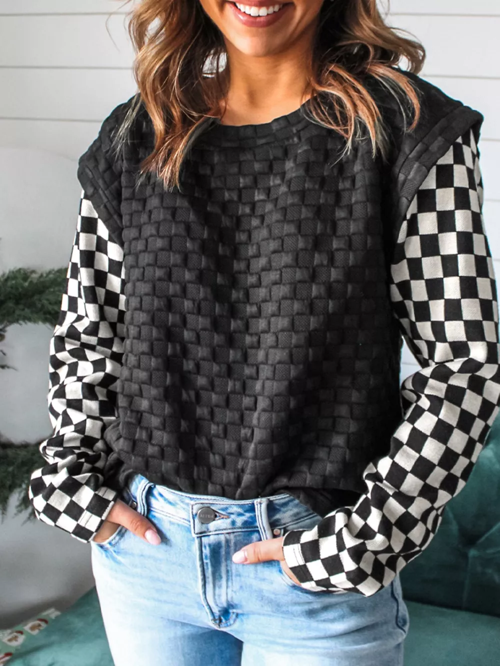 Textured Contrast Checkered Patchwork Long Sleeve Top