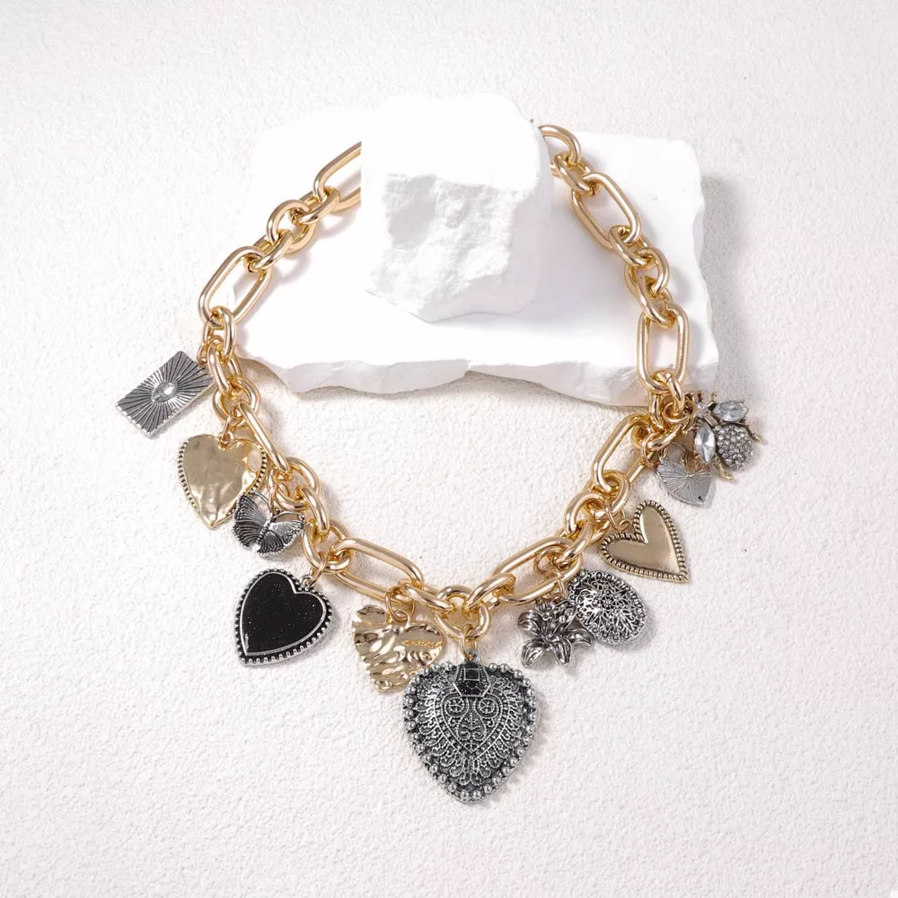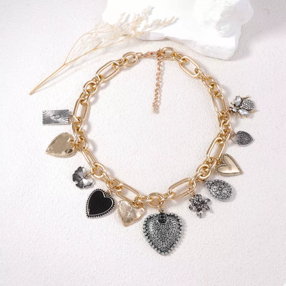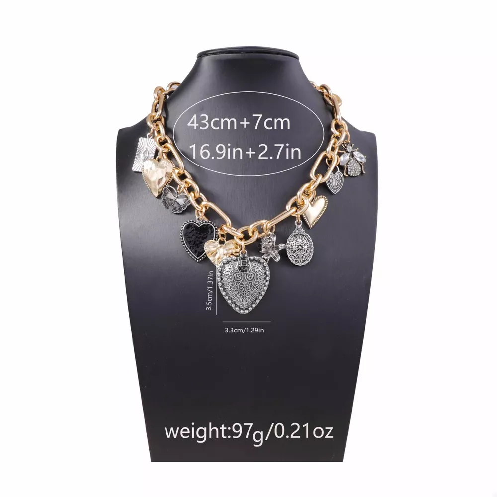 18K Gold-Plated Alloy Heart Charm Chain Statement Necklace