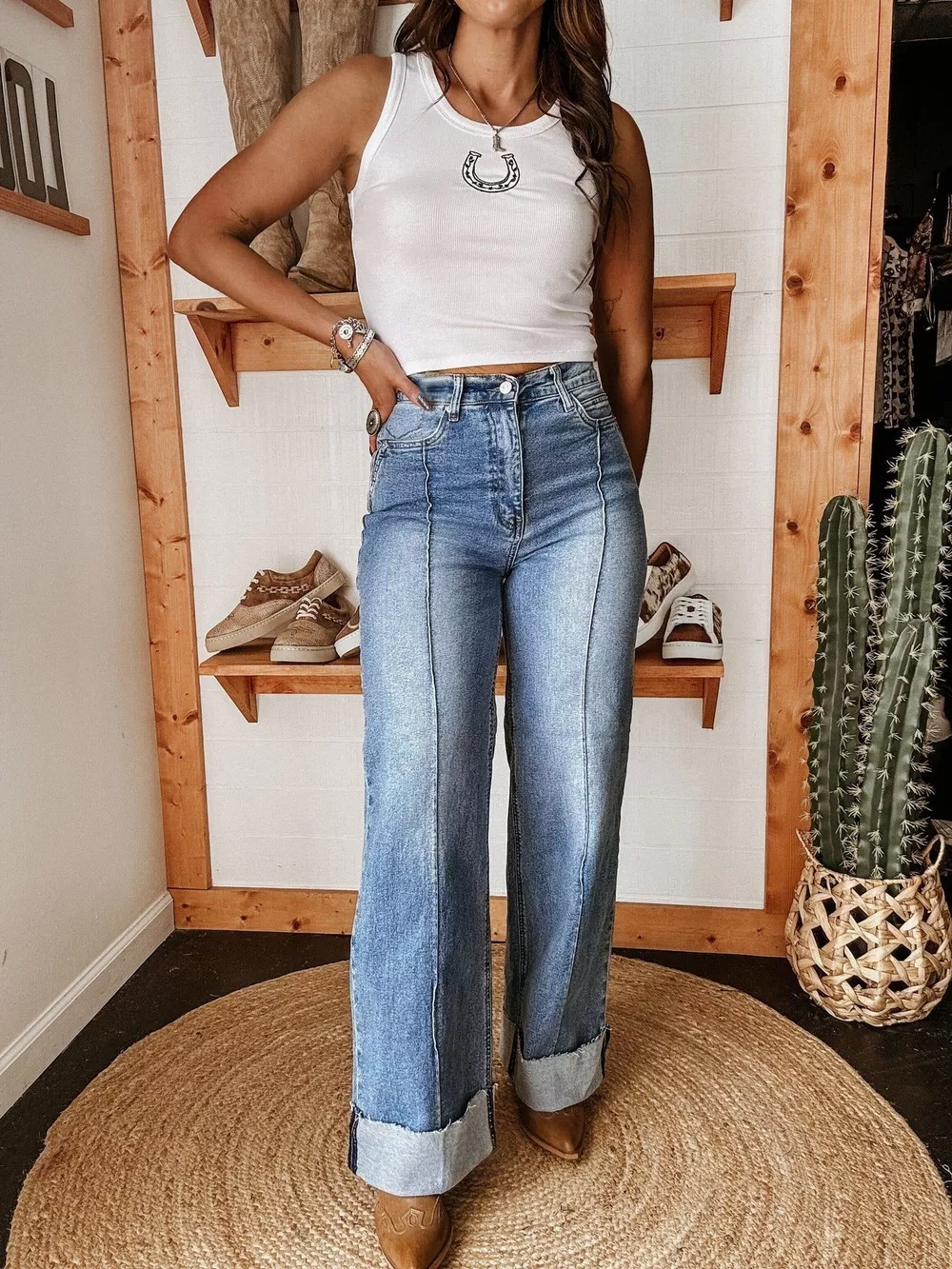 High-Waisted Wide Leg Cuffed Jeans