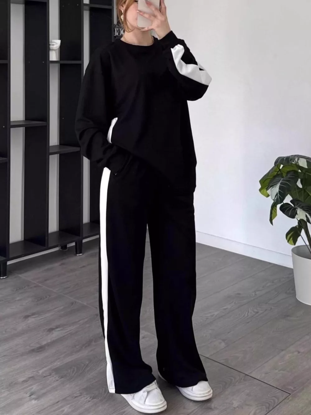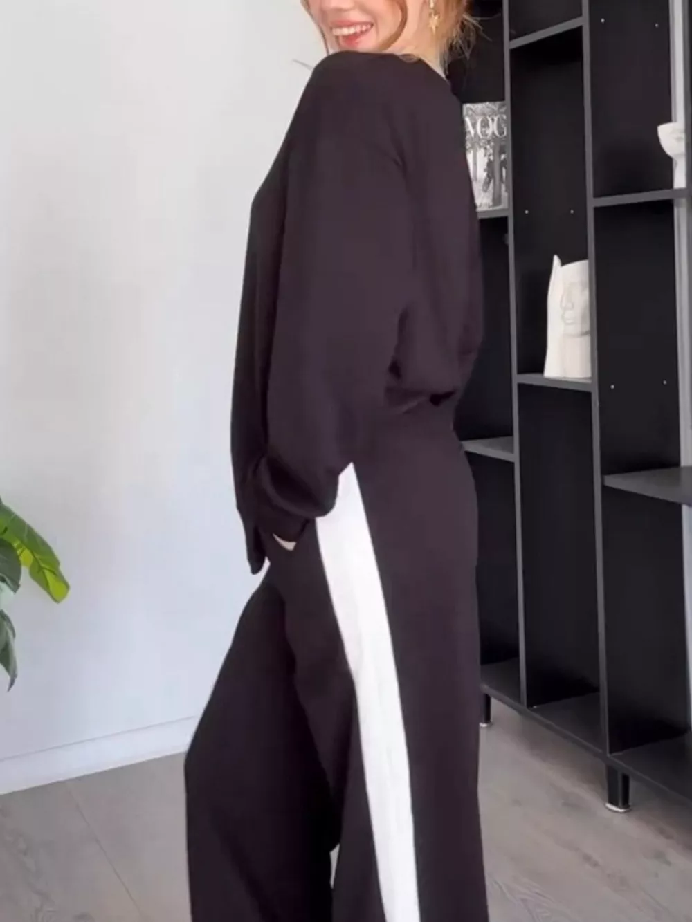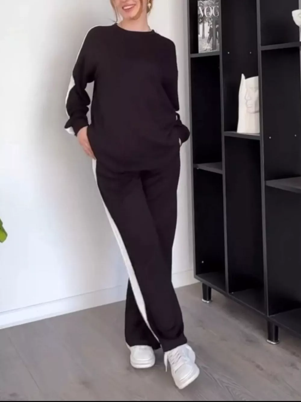 Full Size Contrast Round Neck Top and Pants Set Plus Size