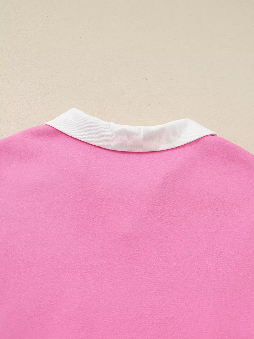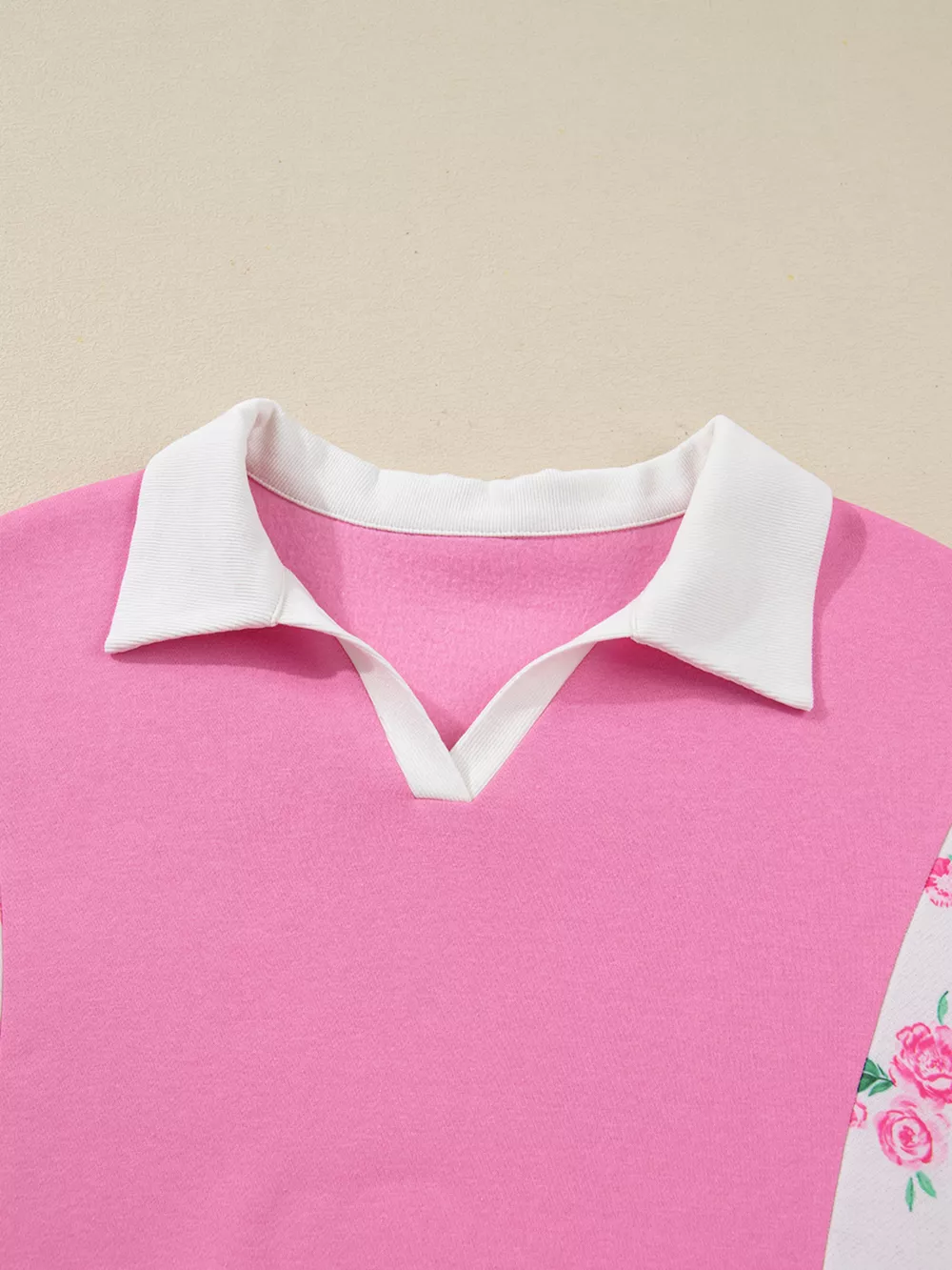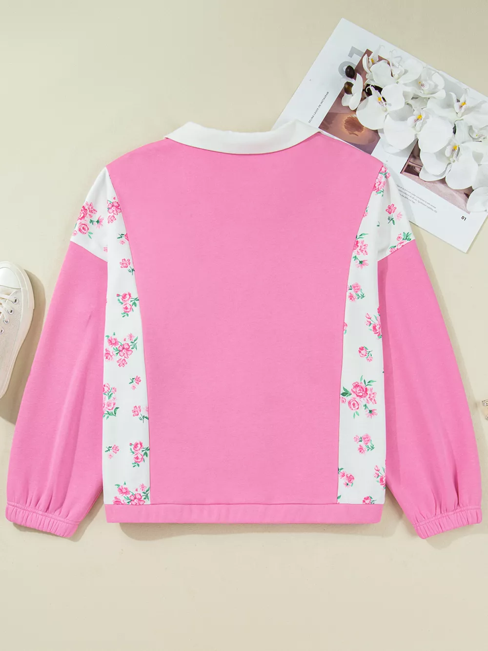 Plus Size Contrast Polo Collar Floral Patchwork Elastic Cuffs Long Sleeve Top