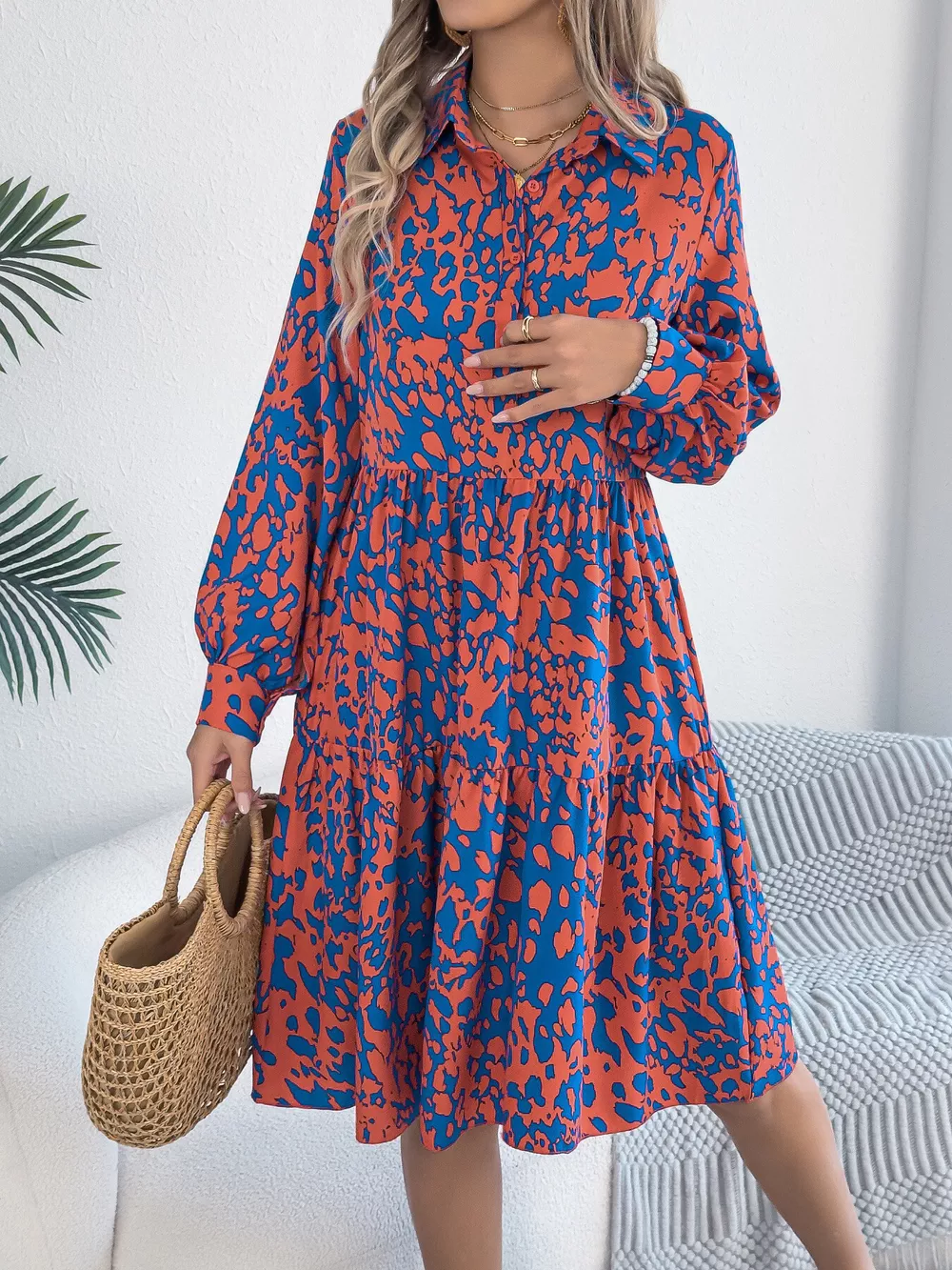 Printed Collared Neck Long Sleeve Dress