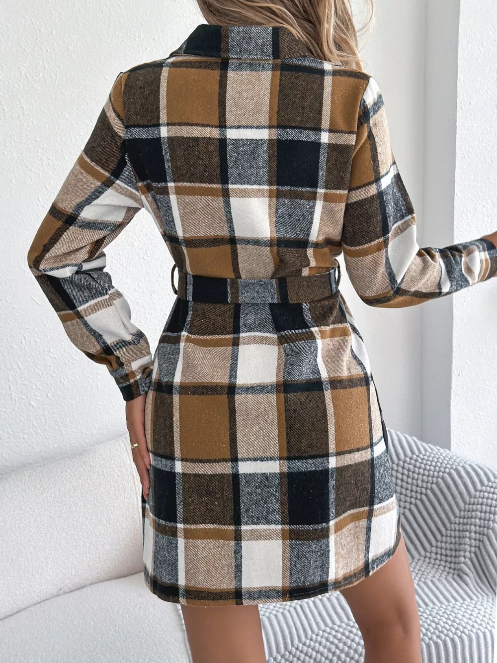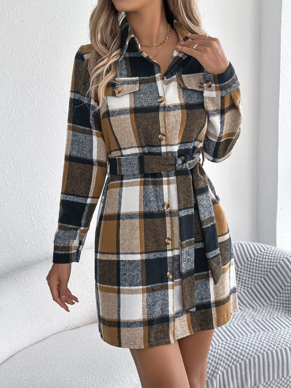 Plaid Button Front Tie Waist Shirt Dress