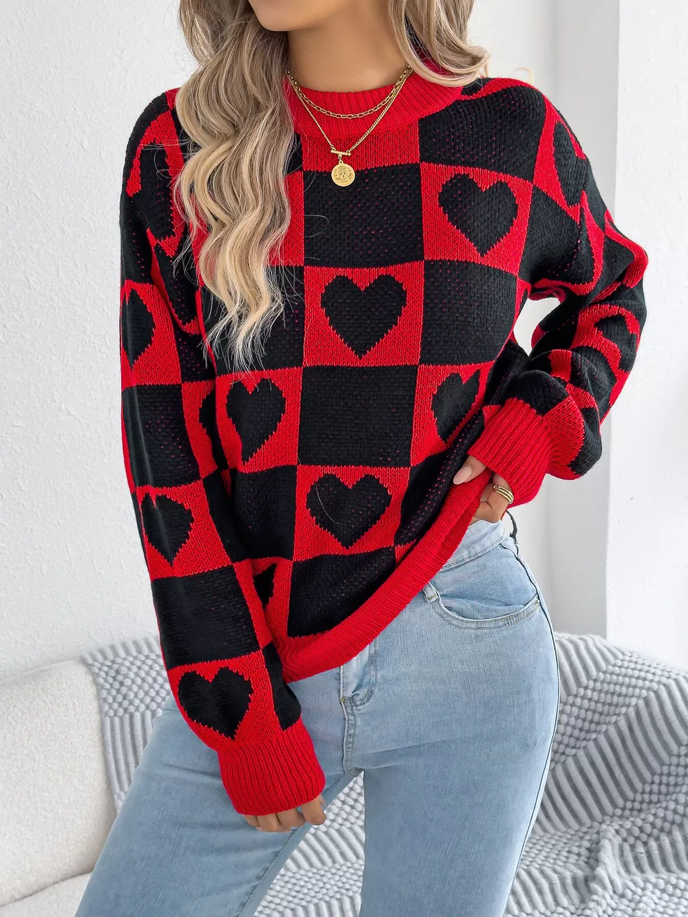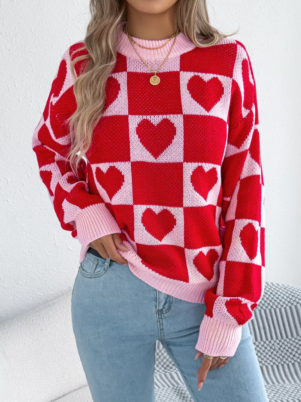 Heart Checkerboard Pattern Round Neck Sweater