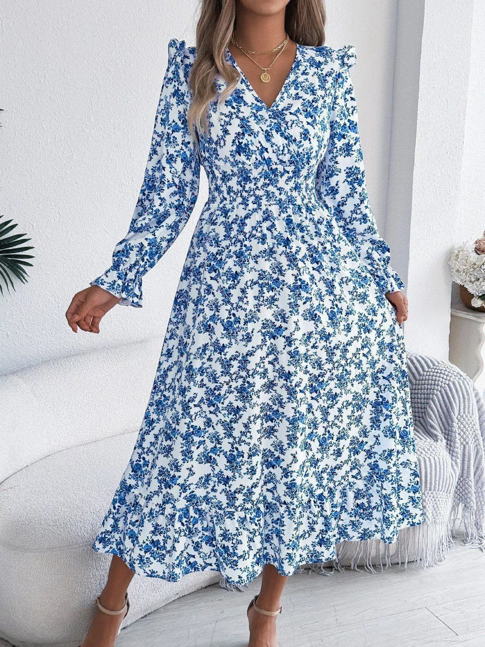 Ruffled Floral V-Neck Flounce Sleeve Dress