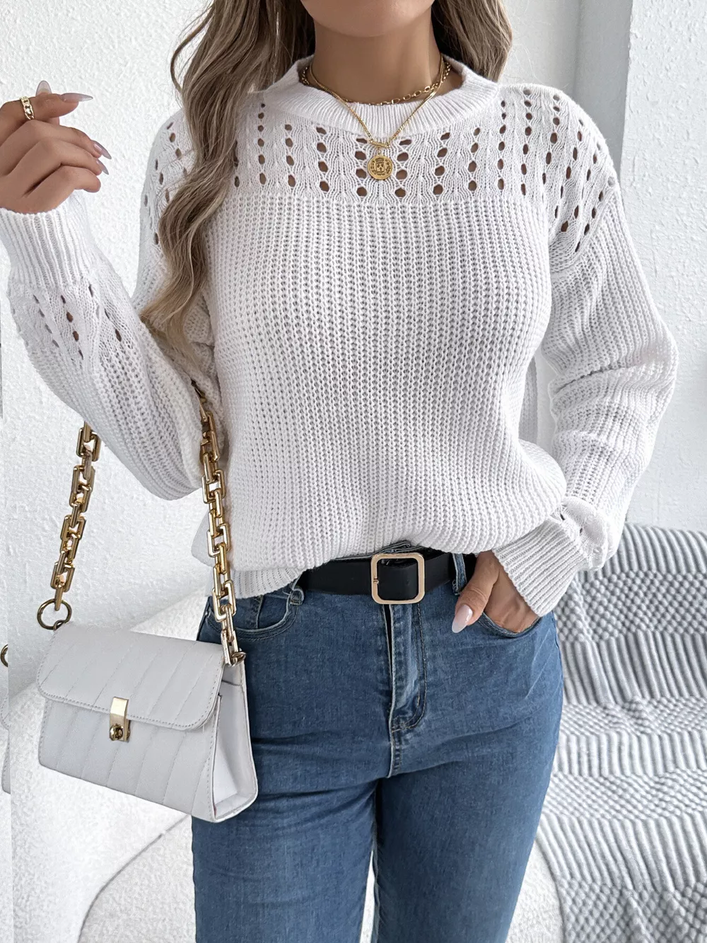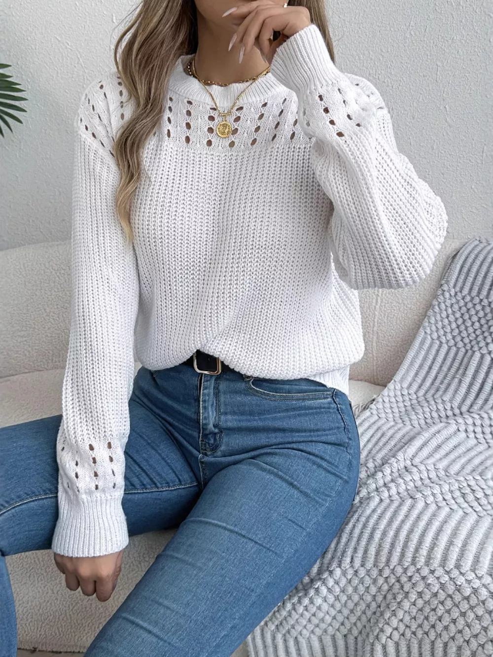 Openwork Round Neck Long Sleeve Sweater