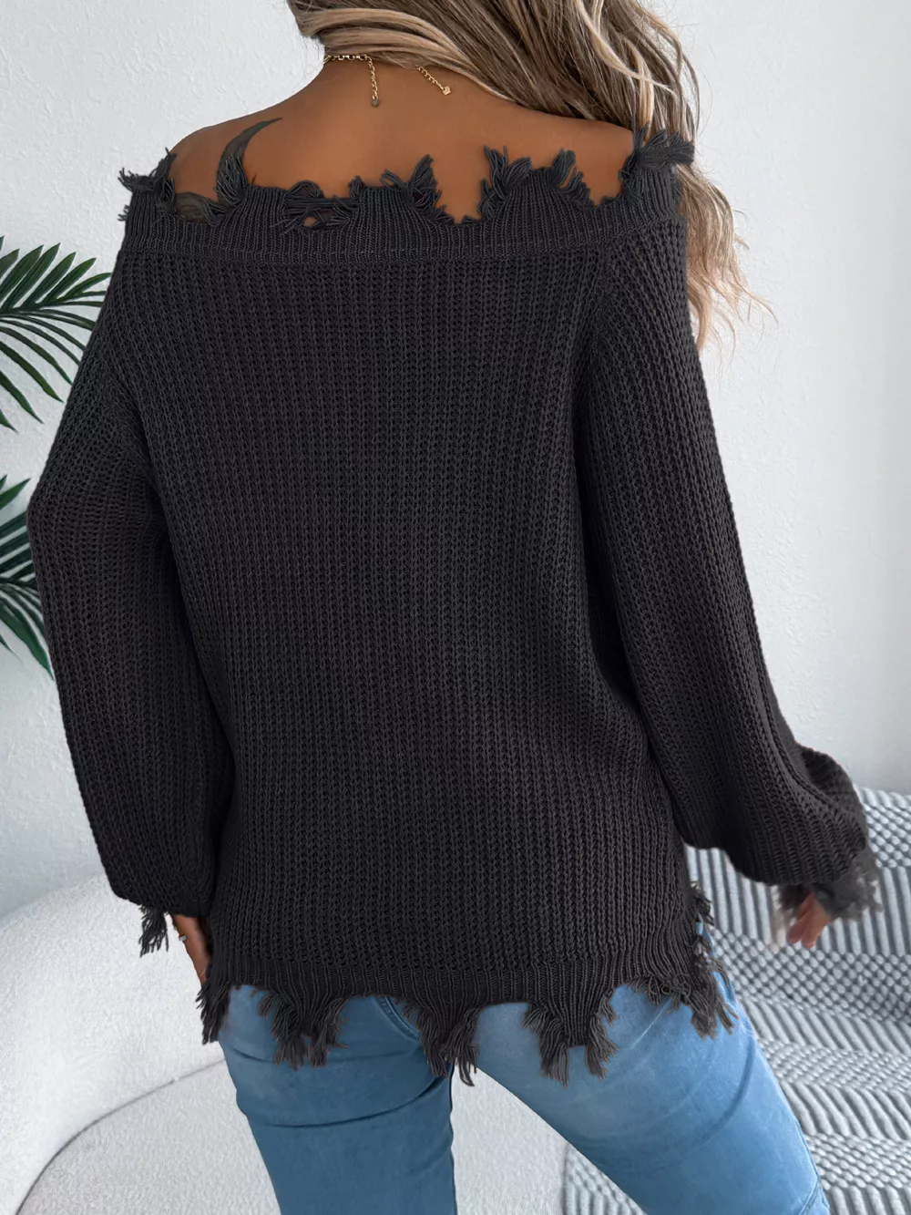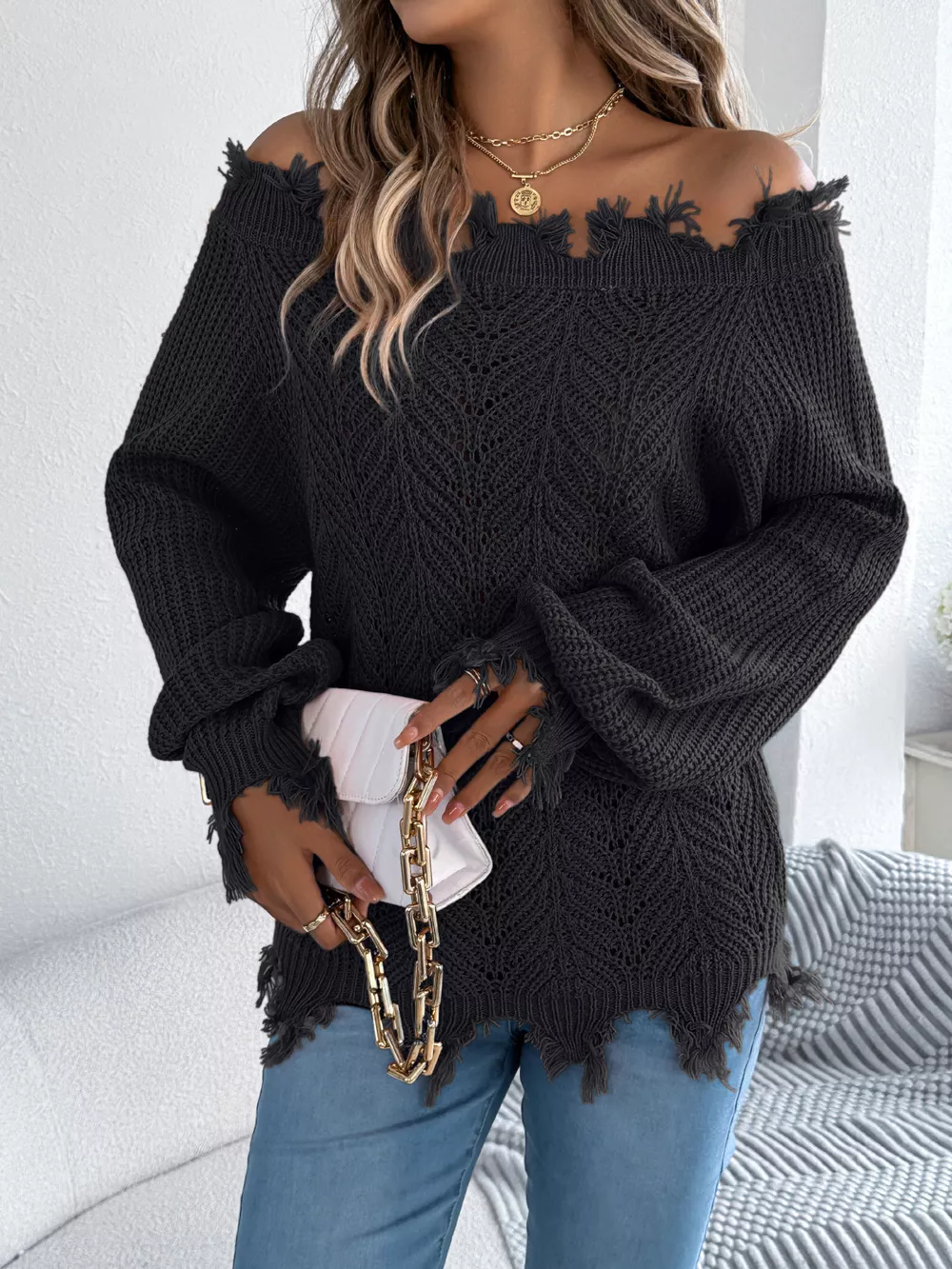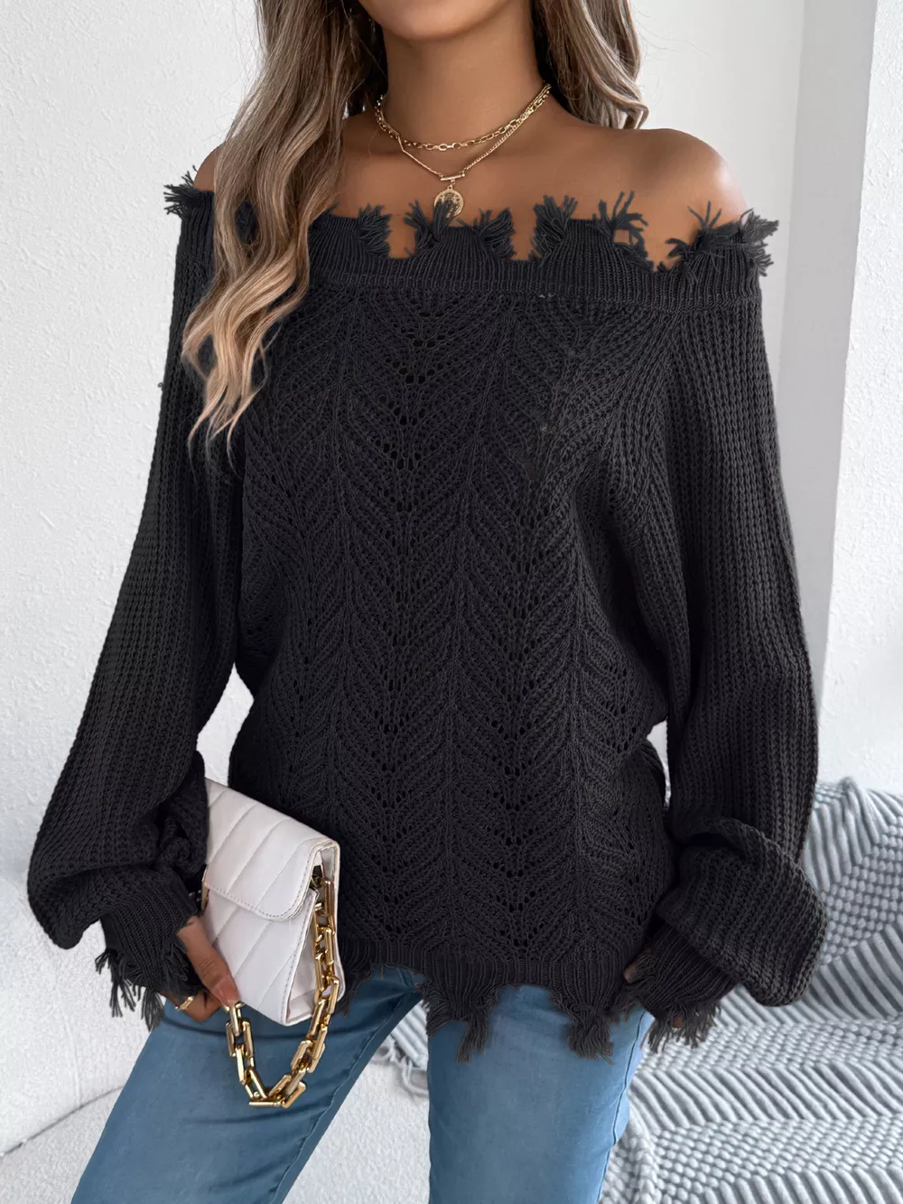 Distressed Hem Openwork Off-Shoulder Sweater