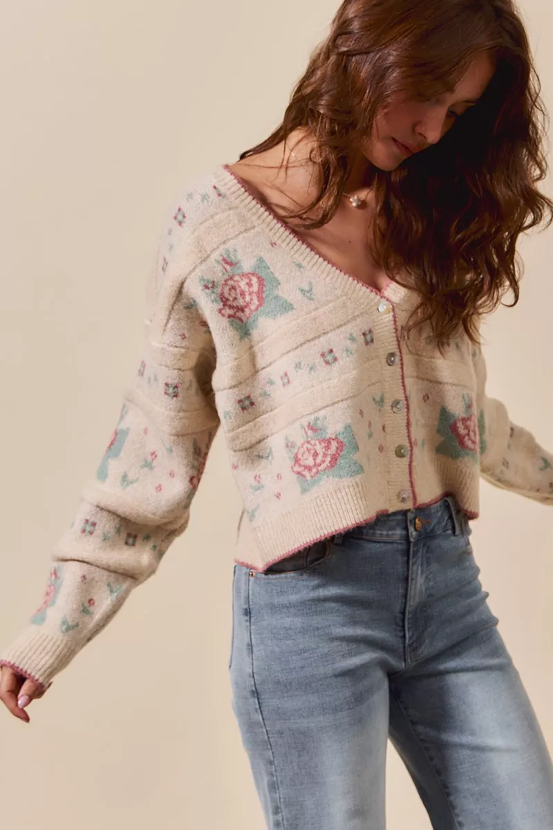 SO ME Floral Pattern Long Sleeve Button Sweater Cardigan