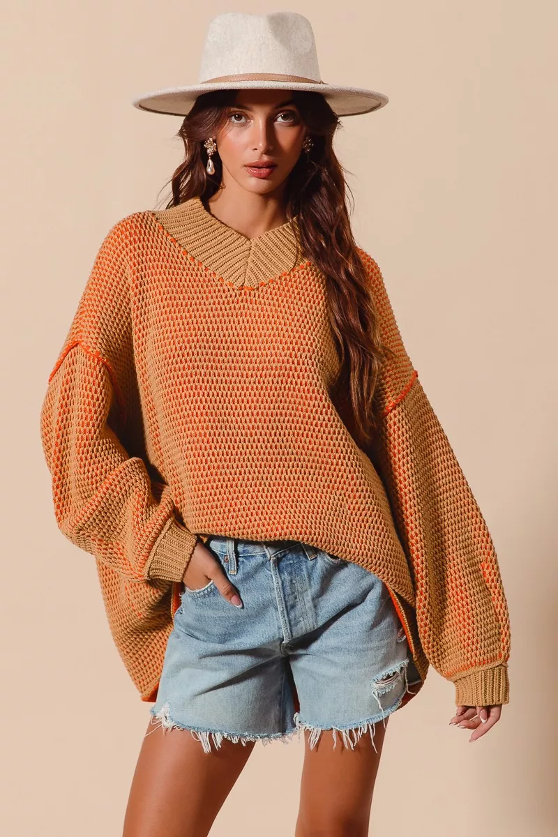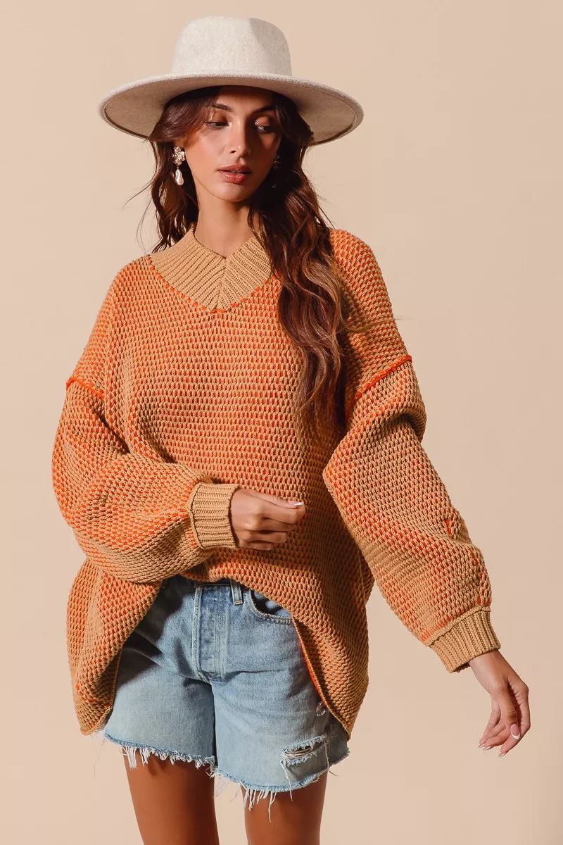 SO ME Oversized Two Tone Textured V Neck Sweater