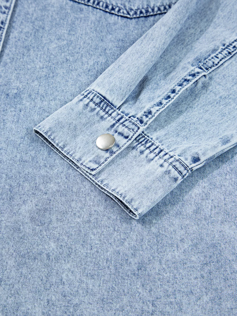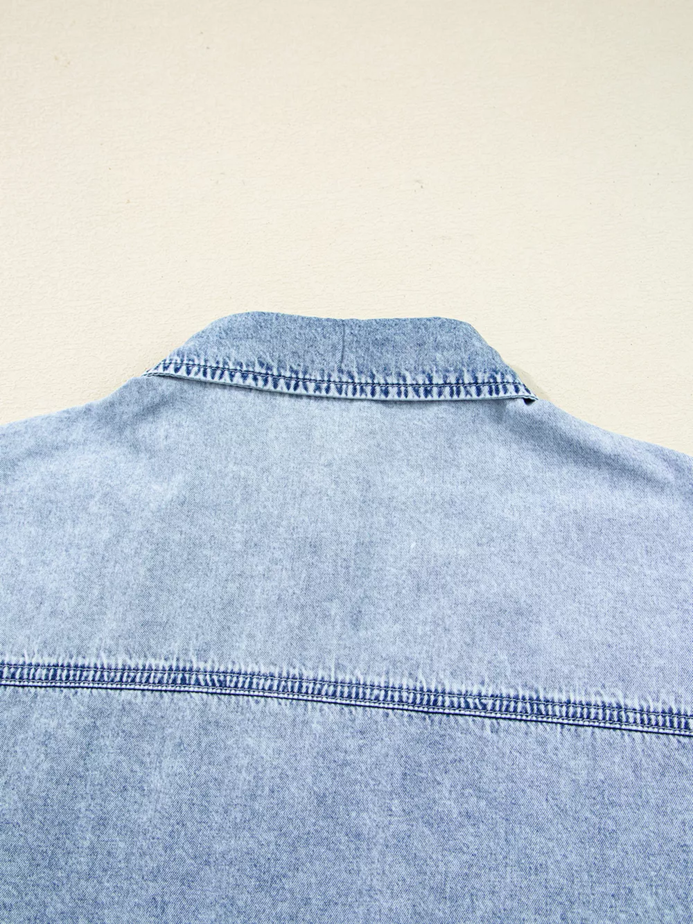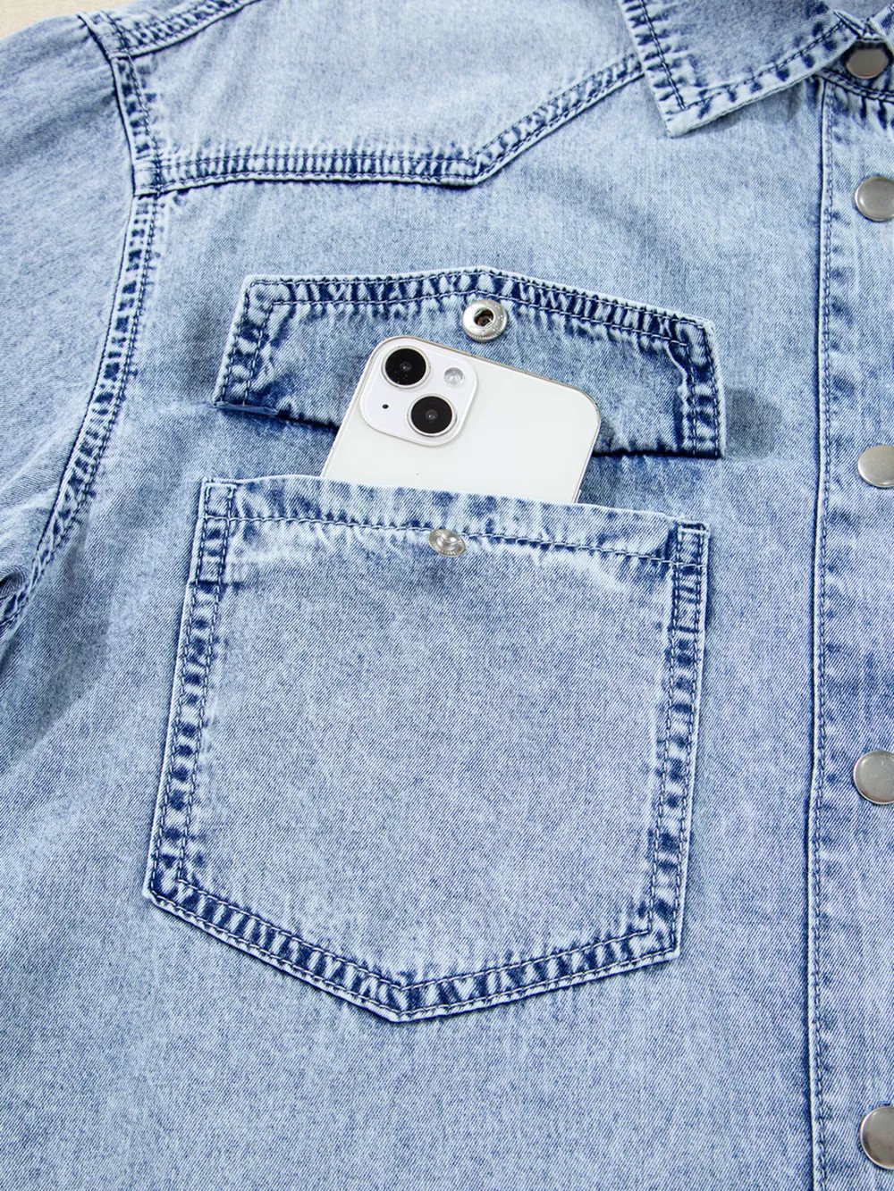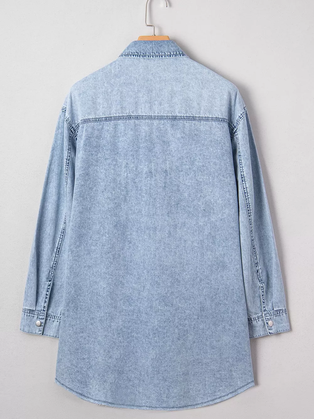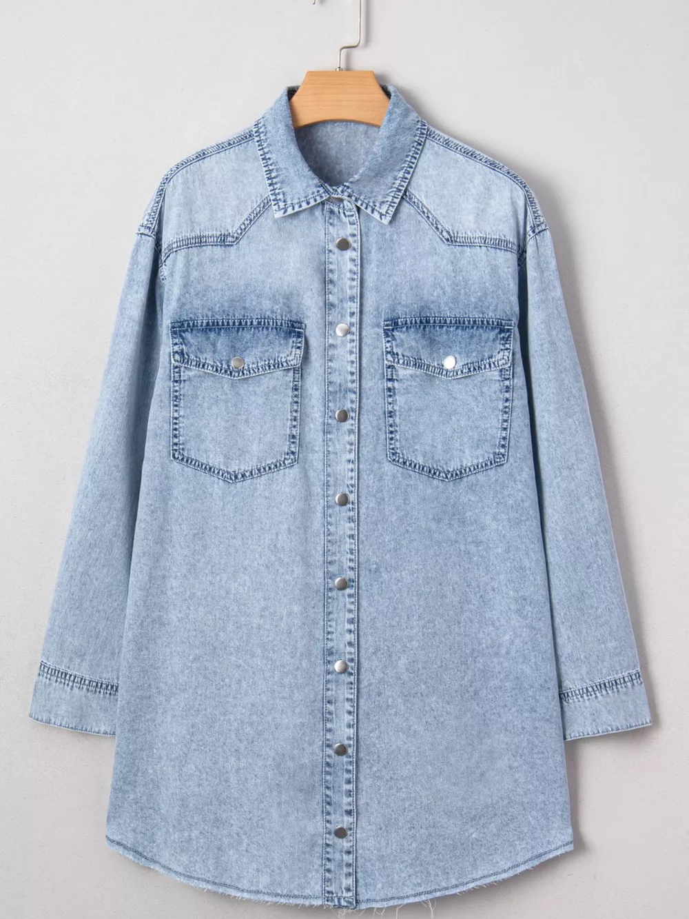 Chest Pocket Raw Hem Denim Loose Shirt Dress