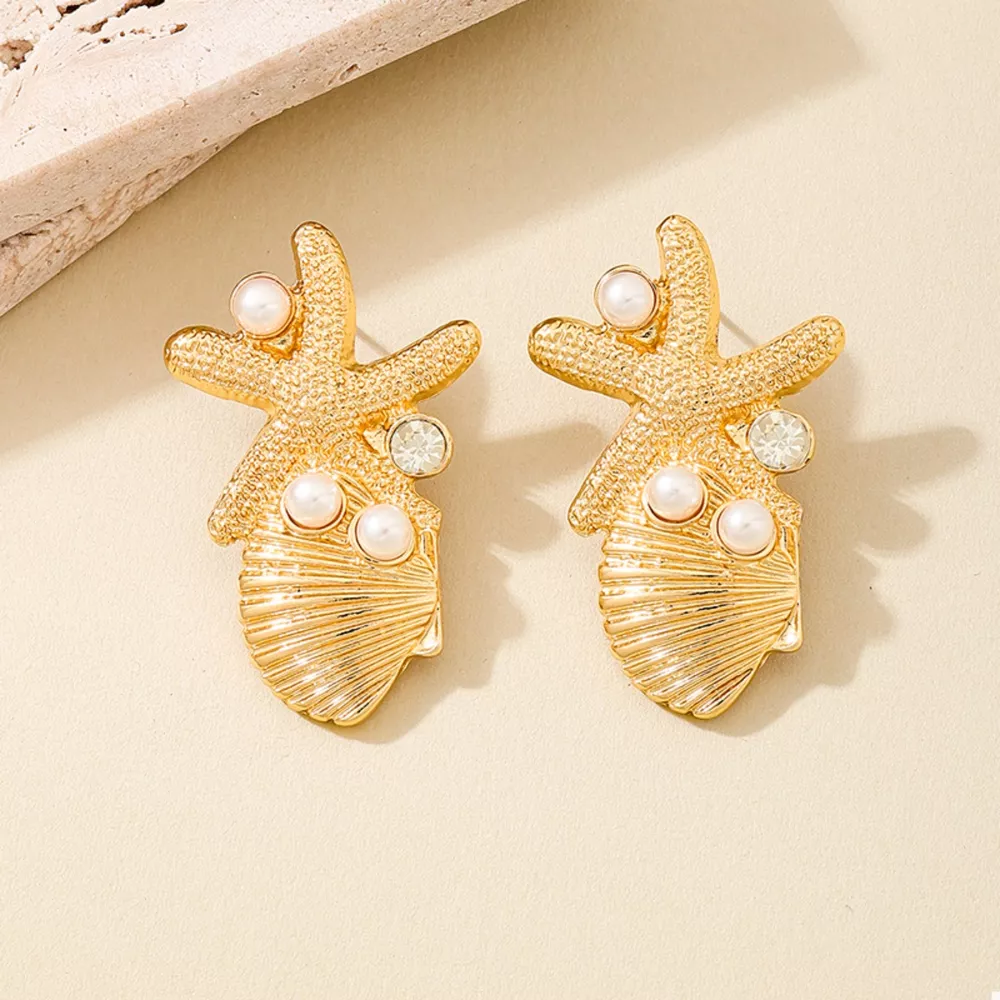 Ocean Starfish Shell Synthetic Pearl Drop Earrings