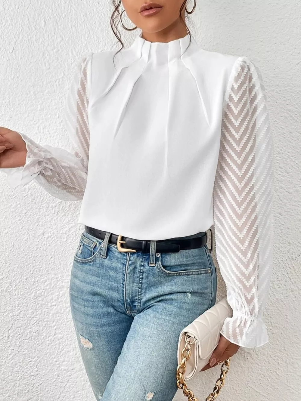 Mock Neck Sheer Lace Sleeve Blouse