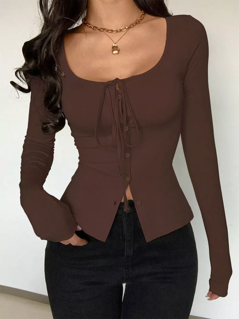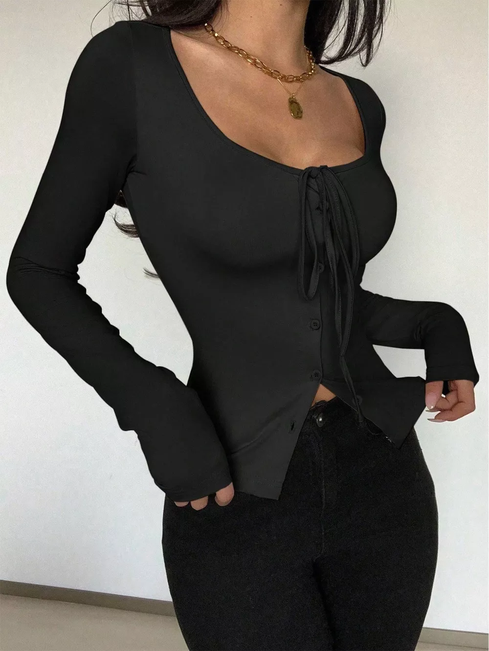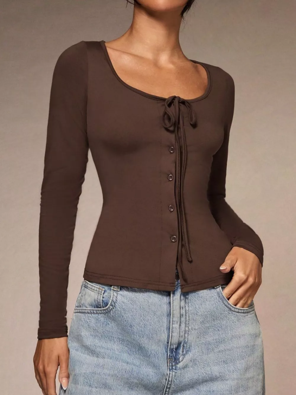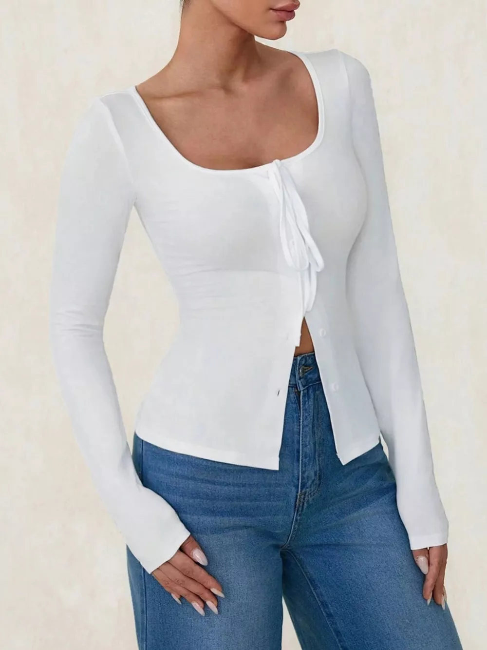 Long Sleeve Scoop Neck Tie Front T-Shirt