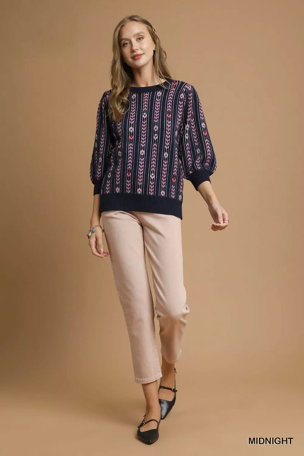 This Jacquard knit puff sleeve sweater showcases a sophisticated Umgee jacquard knit pattern for a chic look. It features a classic crew neckline that is versatile and easy to style. The 3/4 puff sleeves with ribbed cuffs add a trendy and feminine touch to the design. The ribbed hem provides a structured finish to the sweater. Unlined for a lighter feel, this sweater is an elegant choice for any occasion.