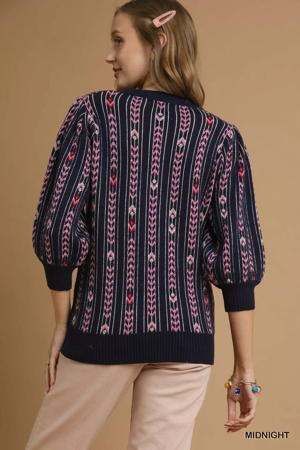 Umgee Jacquard Knit Puff Sleeve Sweater