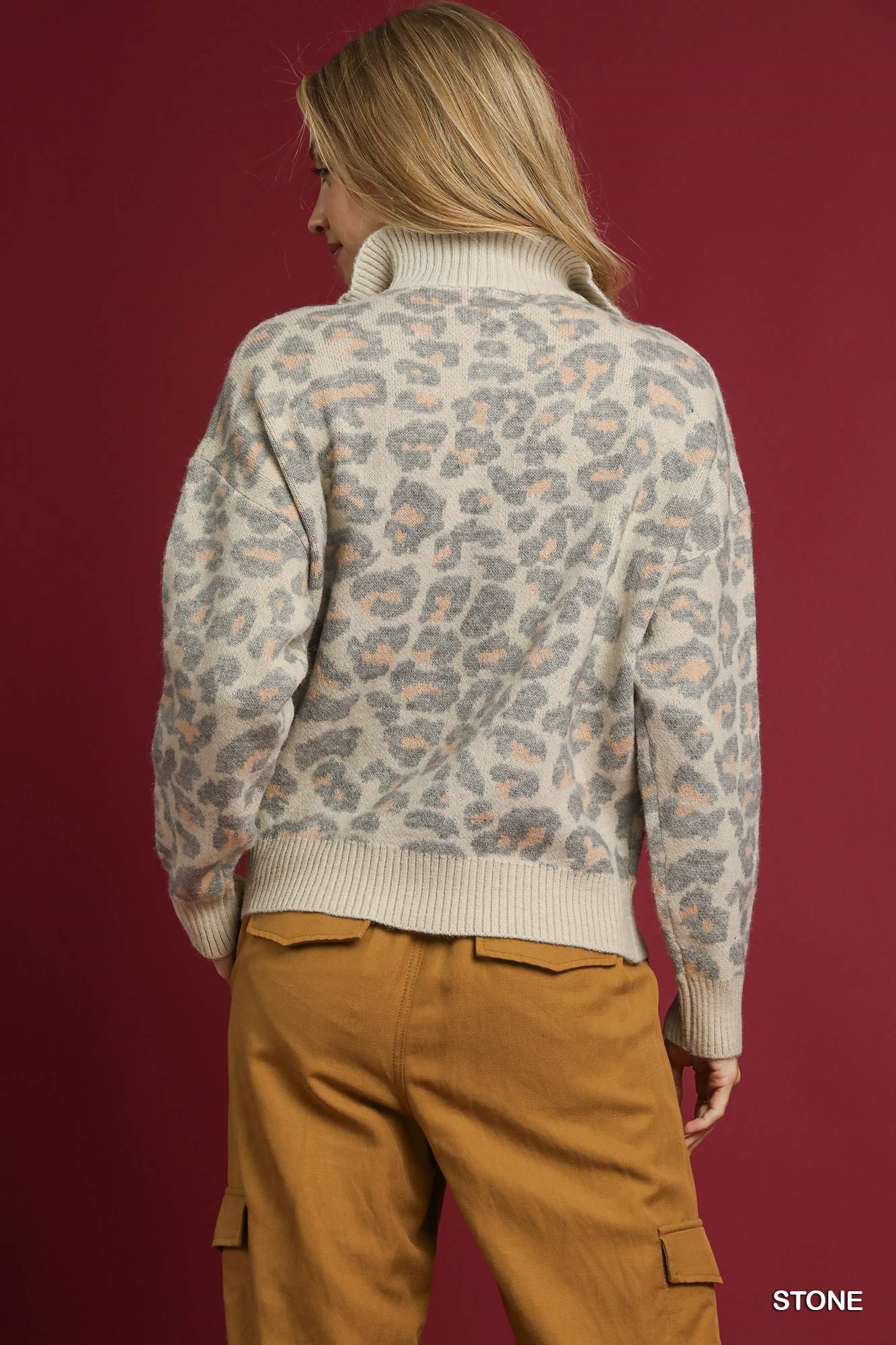 Umgee Leopard Print Quarter-Zip Knit Sweater