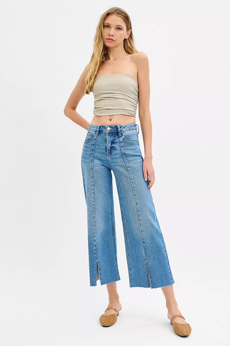 RISEN Tummy Control Mid Rise Crop Wide Front Slit Jeans