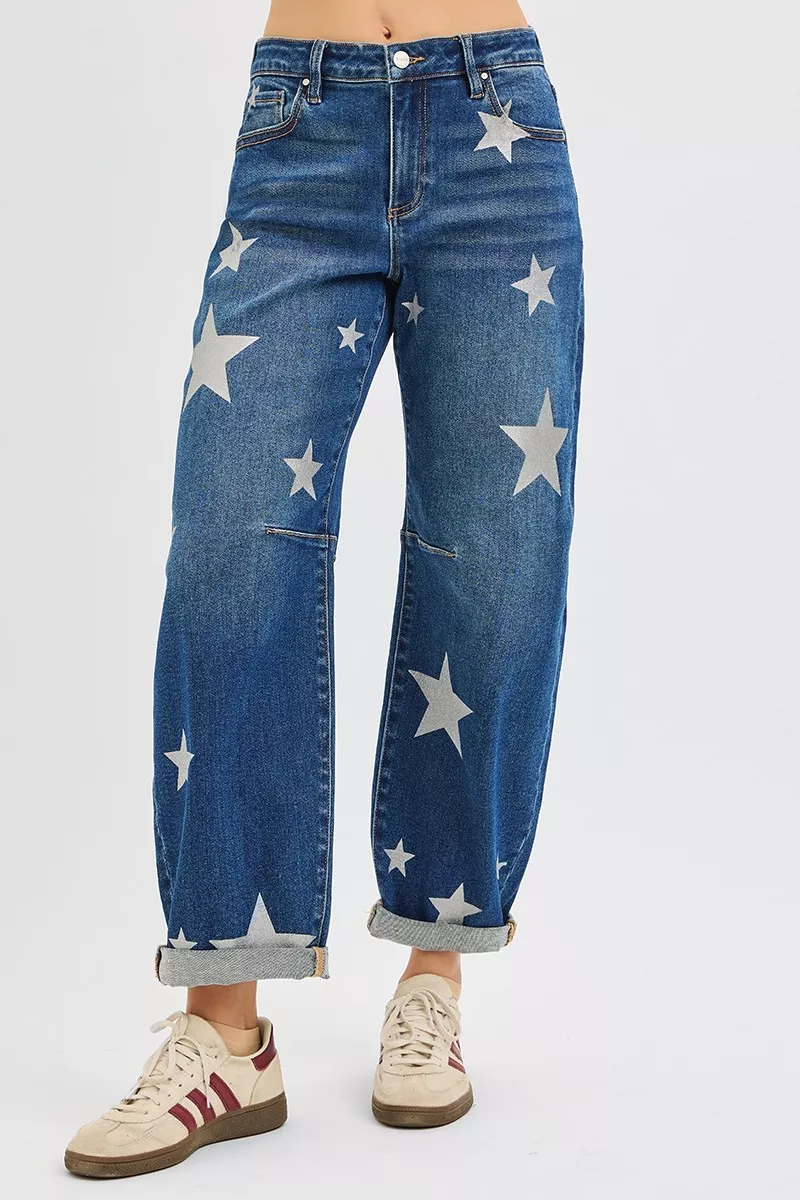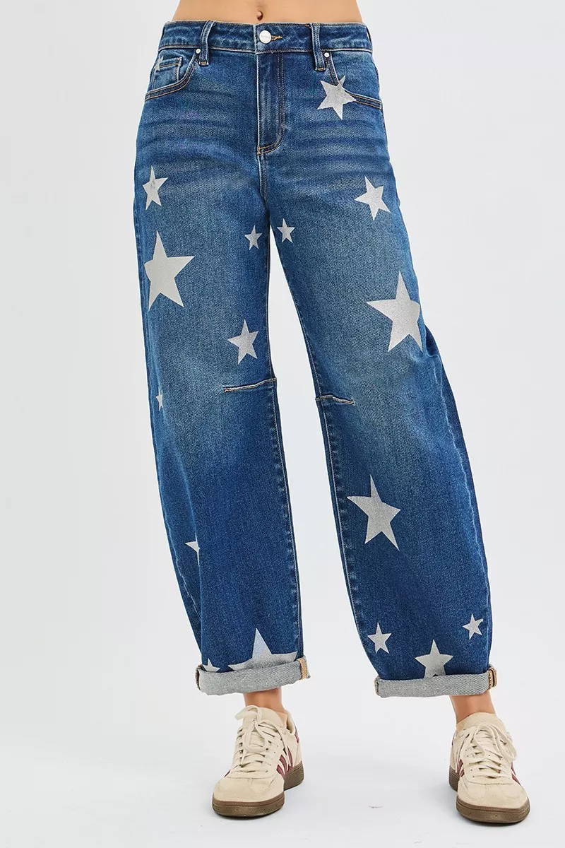RISEN Mid Rise Ankle Length Relaxed Barrel Star Printed Jeans