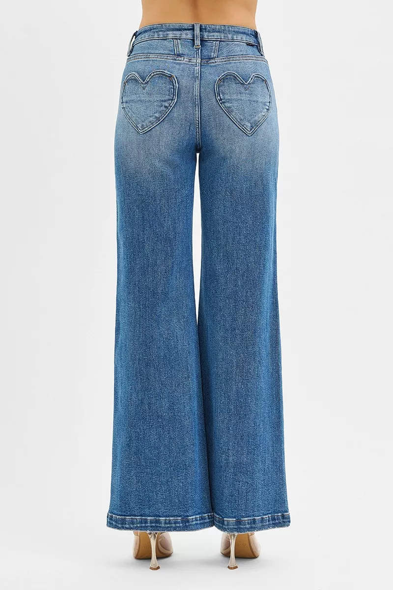 RISEN High Rise Wide Leg Jenas with Front Yoke and Heart Back Pocket