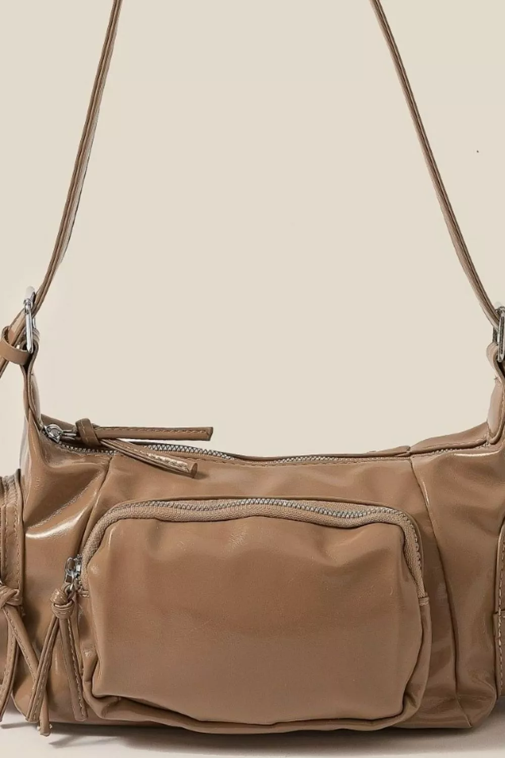 This stylish multi-pocket crossbody handbag features premium faux leather construction in a versatile taupe color. The bag showcases multiple zippered compartments on the front panel for superior organization and easy access to essentials. The adjustable crossbody strap offers comfortable hands-free carrying while the compact design provides ample storage without bulk. Silver-tone hardware adds a modern touch to this practical everyday accessory. Perfect for busy lifestyles, this handbag combines functionality with contemporary style, making it ideal for work, travel, or casual outings.