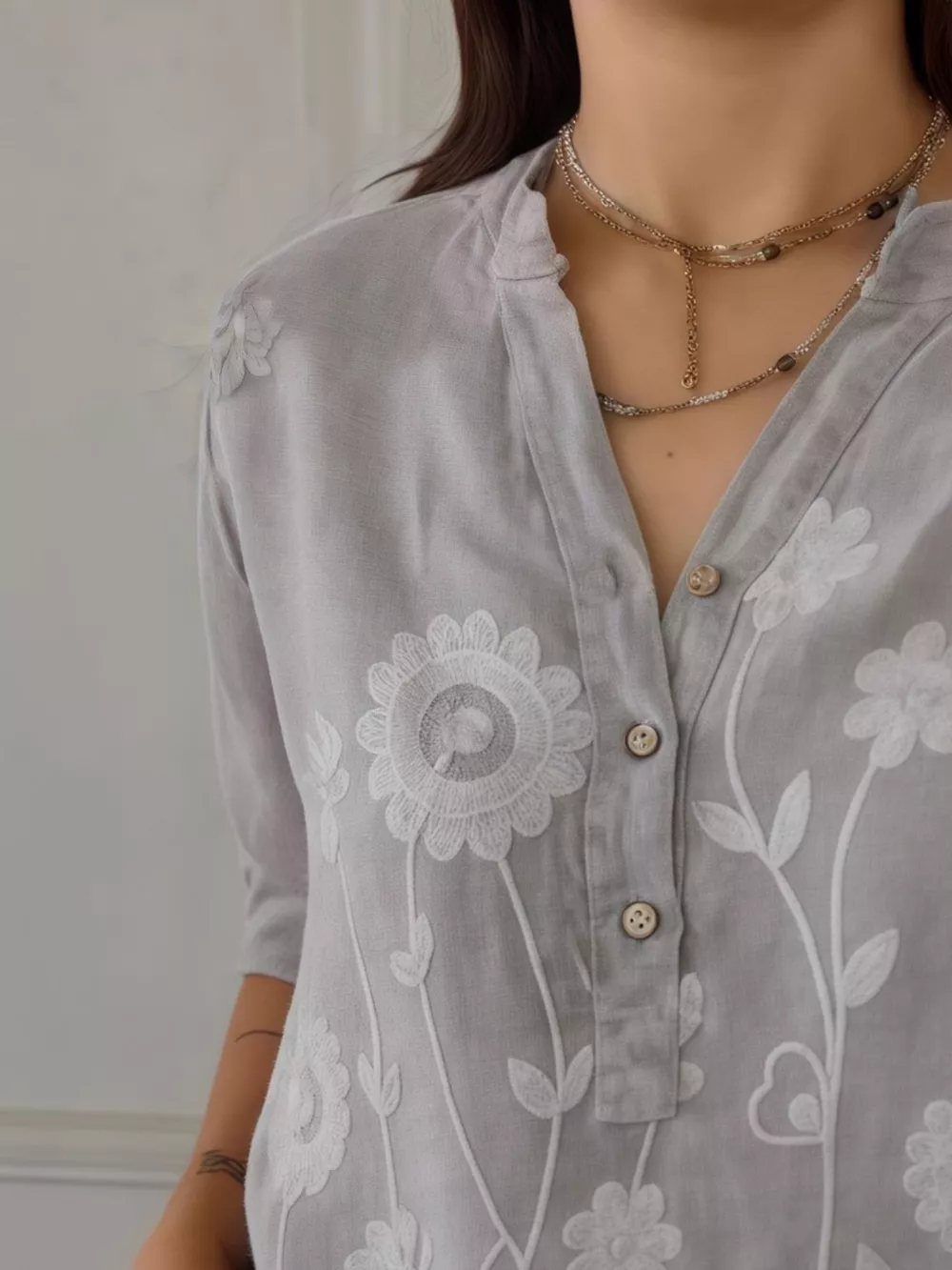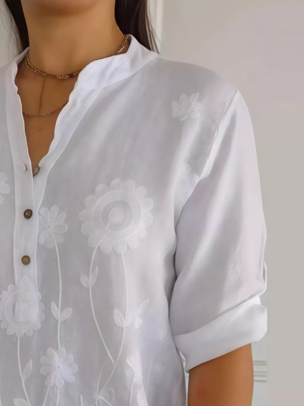 Full Size Floral Embroidered Button Detail Blouse Plus Size