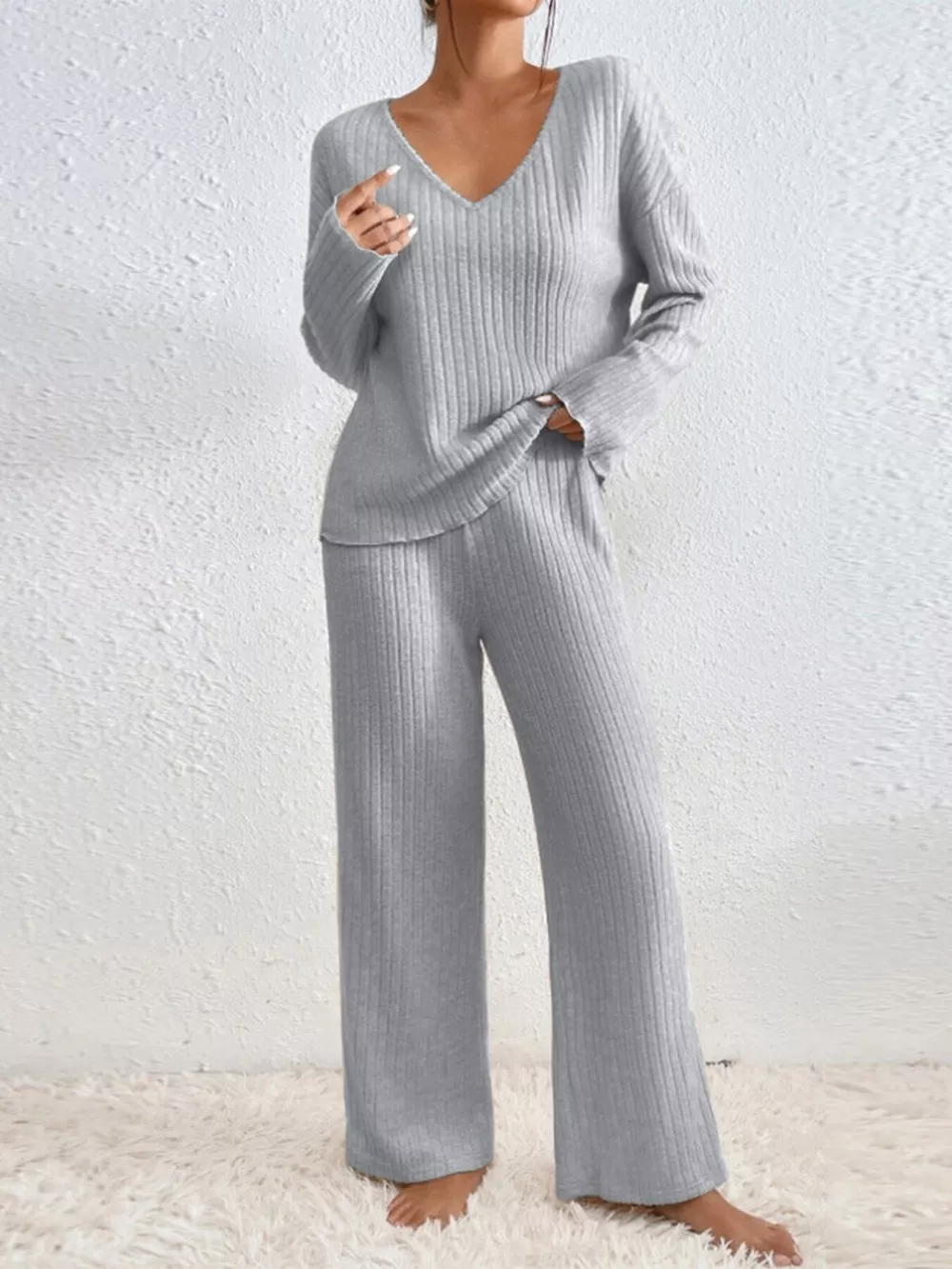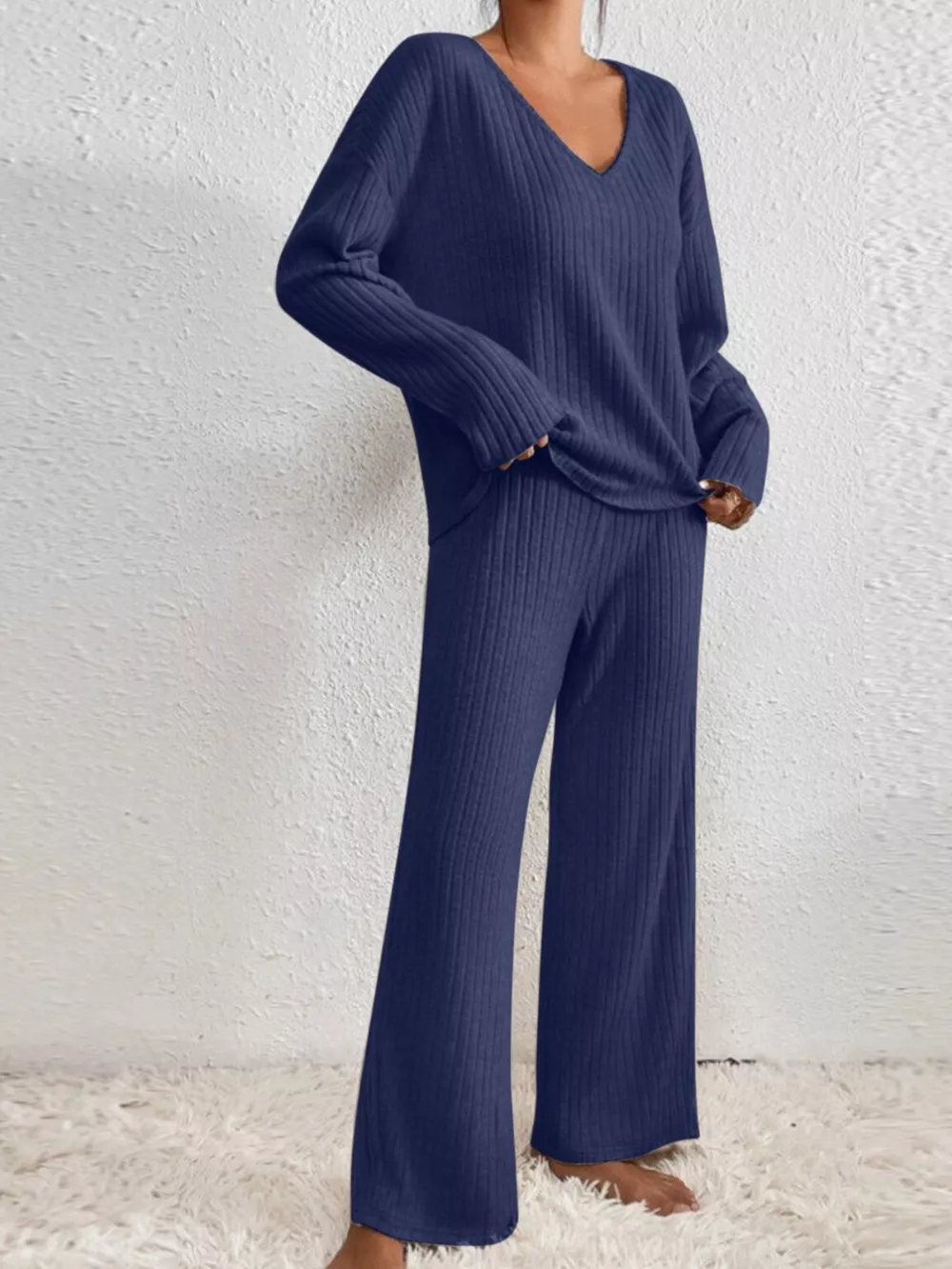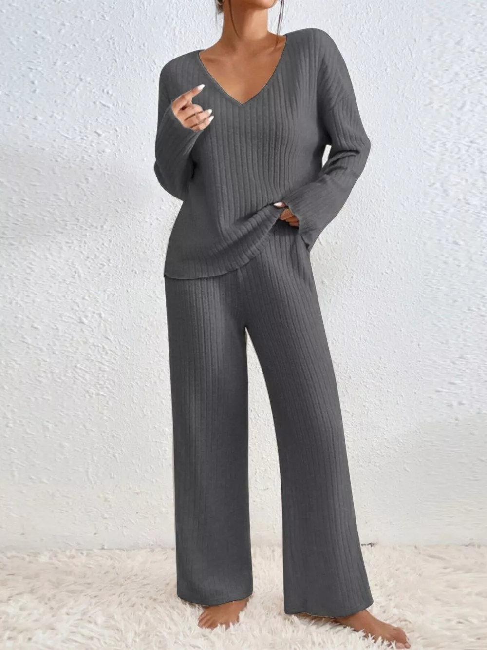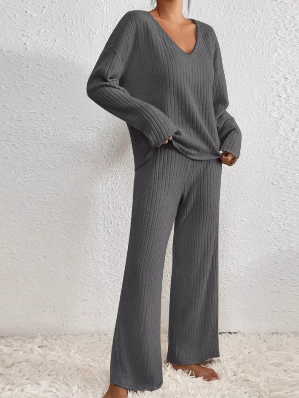 Ribbed V-Neck Top and Pants Set