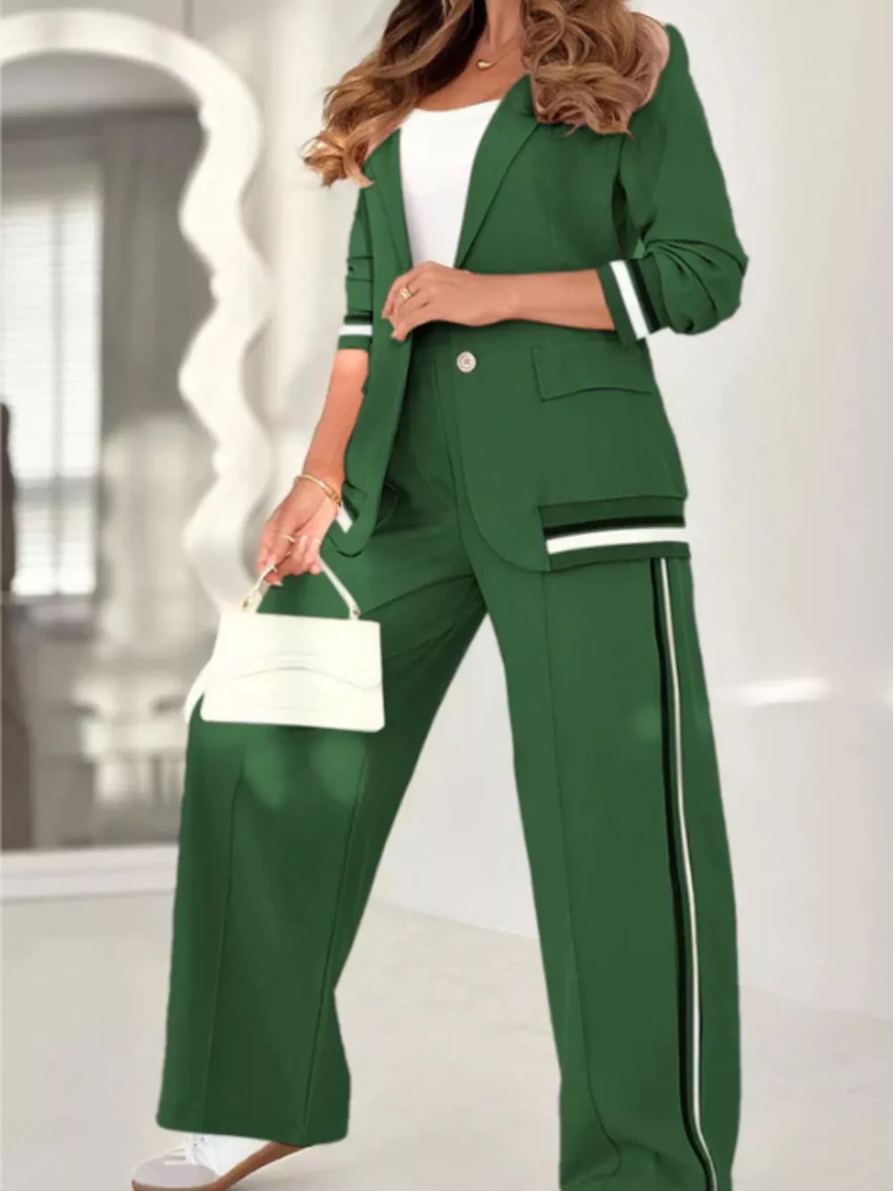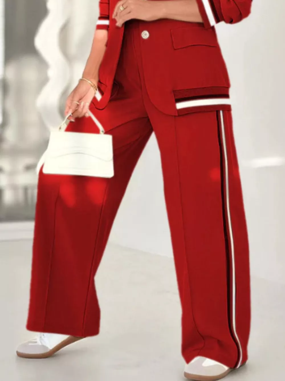 Full Size Striped Trim Button Down Jacket and Pants Set Plus Size