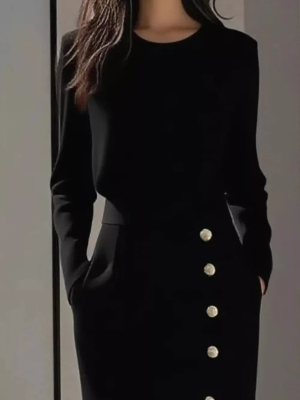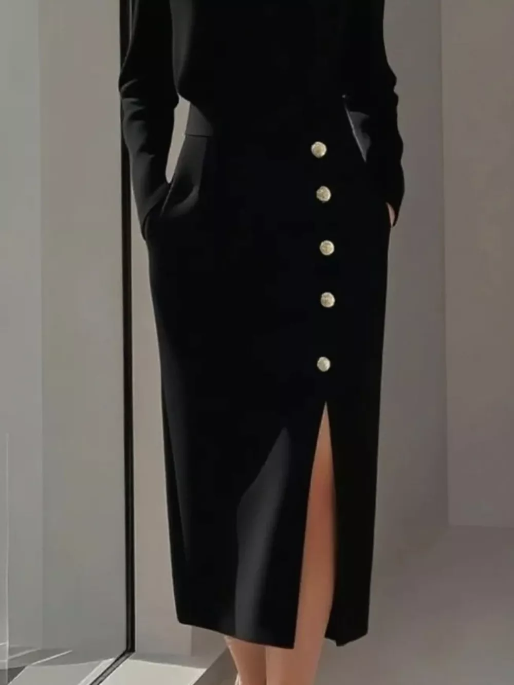 Long Sleeve Button Detail Midi Dress with Side Slit