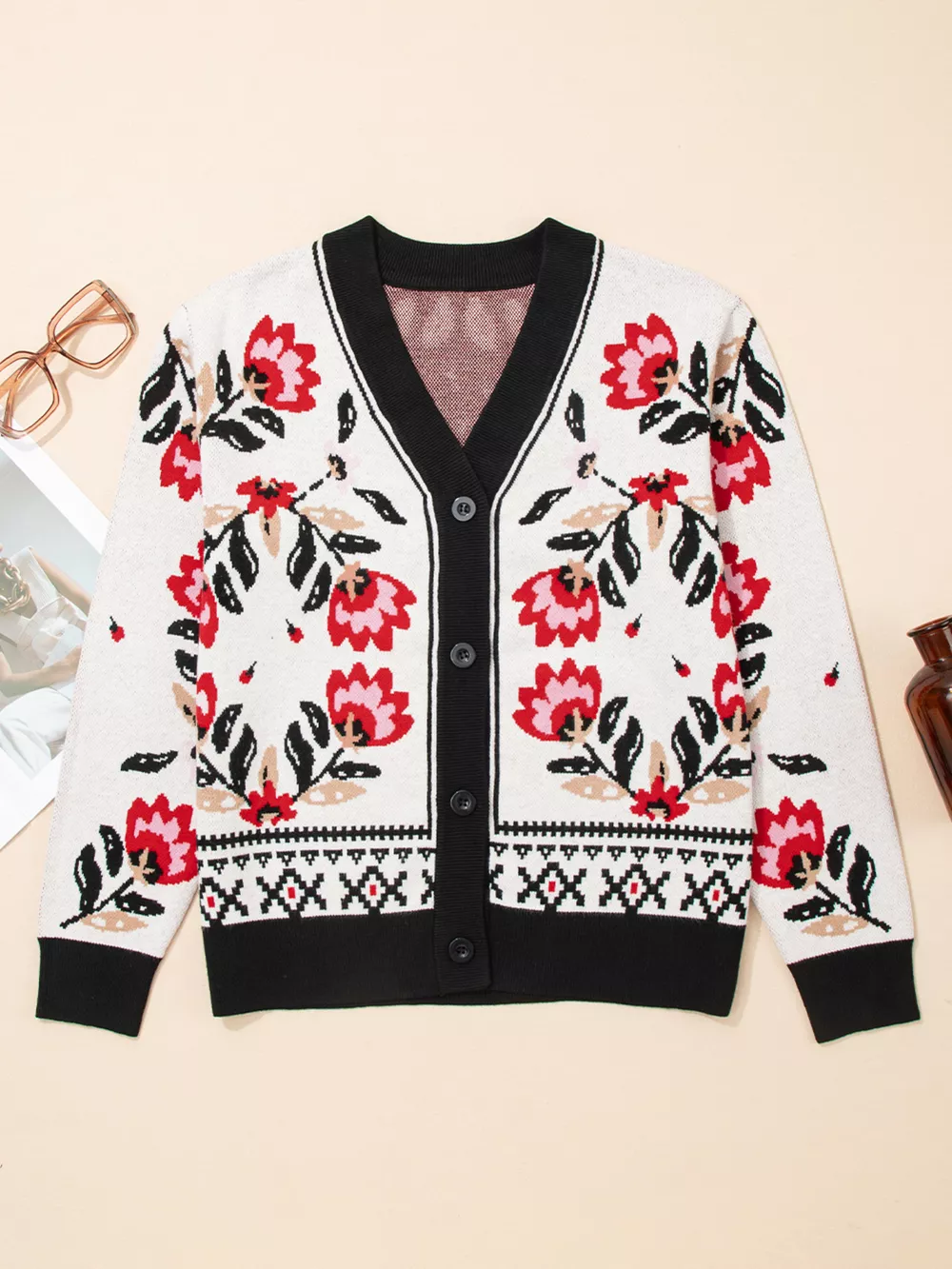 Floral Button Down Cardigan with Geometric Border