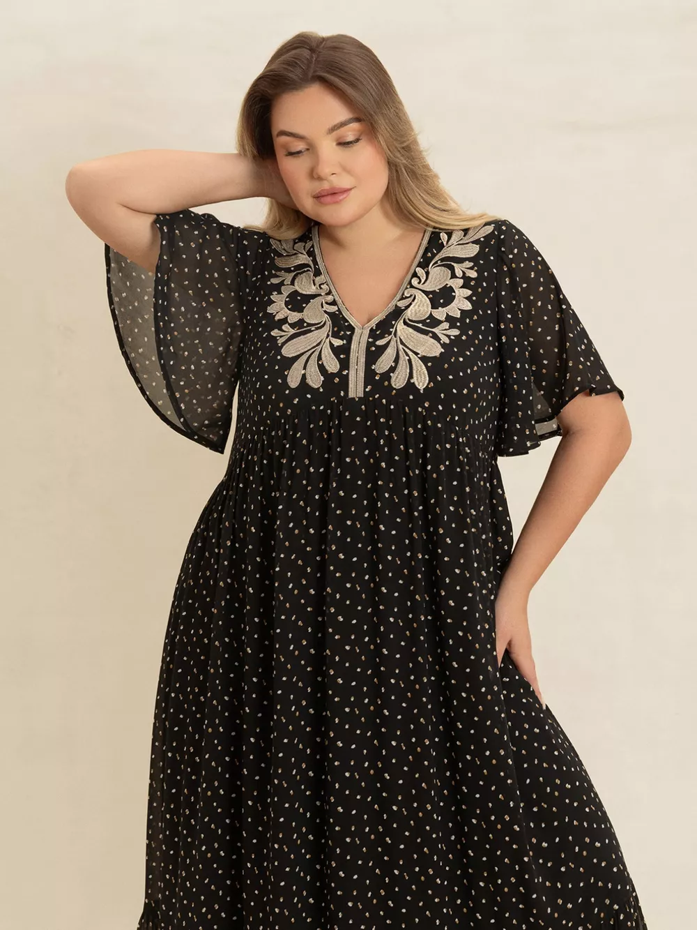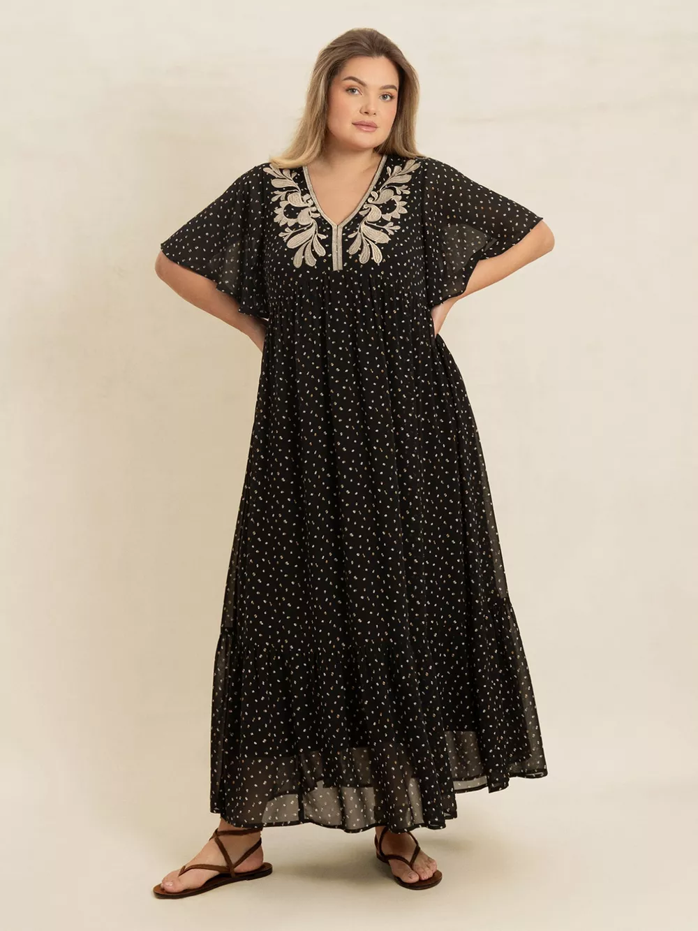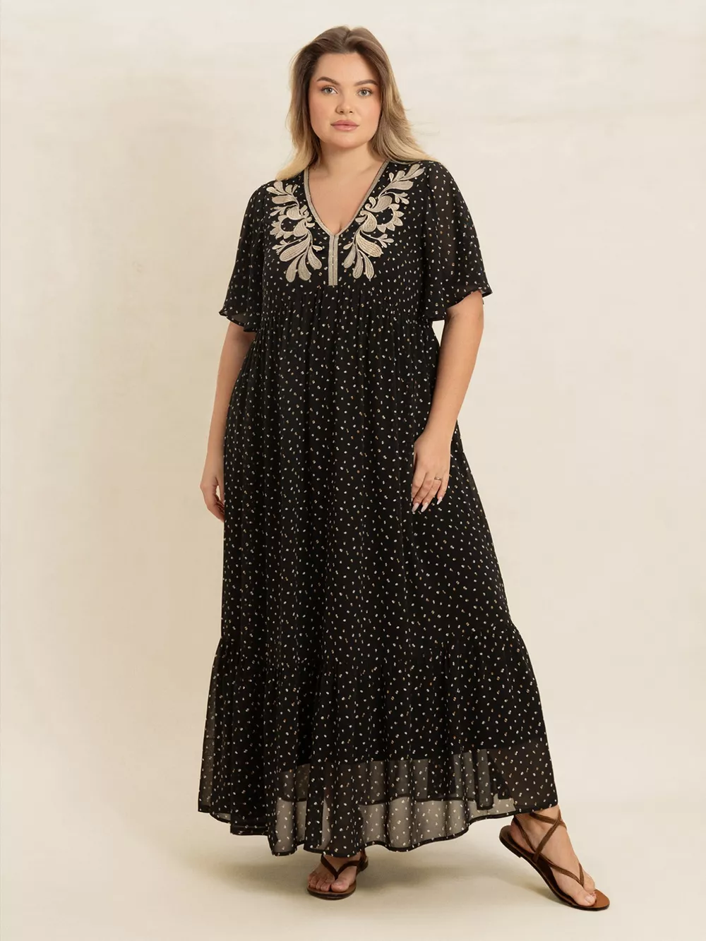 Plus Size Printed V-Neck Flutter Sleeve Maxi Dress