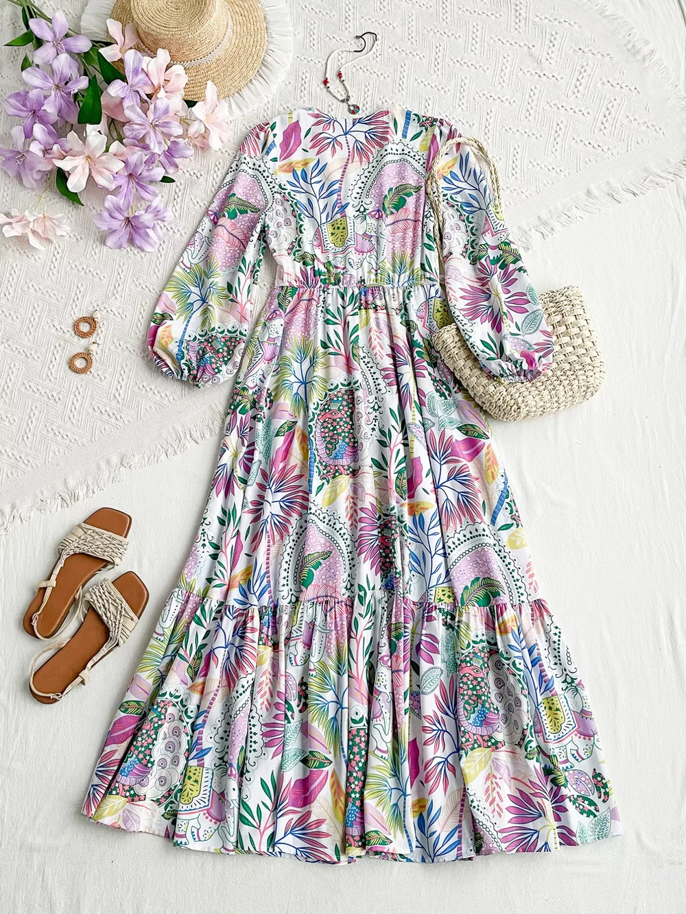 Lace Detail V-Neck Balloon Sleeve Dress